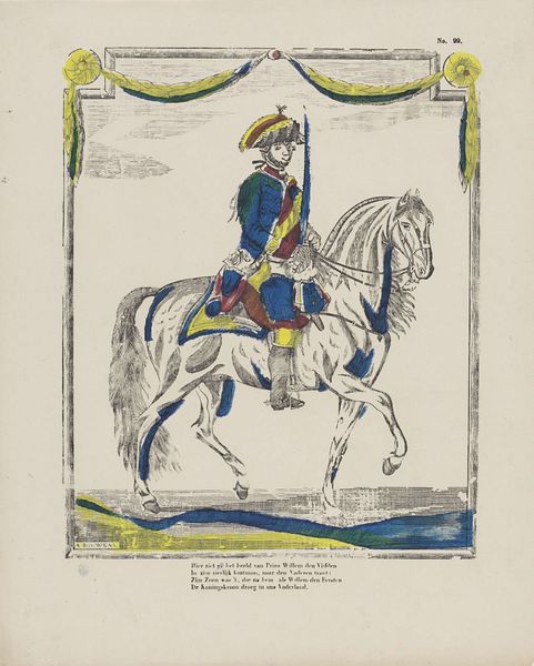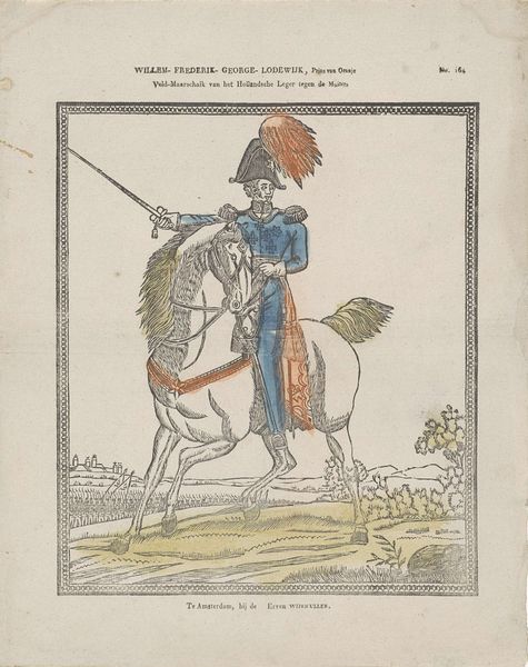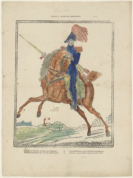 This print depicts Willem de Tweede, King of the Netherlands, on horseback with a sword raised high. The equestrian portrait is a powerful symbol, echoing ancient Roman emperors and Renaissance leaders, projecting authority and command. The raised sword, a gesture seen across centuries, signifies military strength, justice, and the divine right to rule. This symbol evolved from practical battlefield commands to a theatrical display of power. But let us consider the psychological weight of this image. The horse, representing primal instincts, combined with the figure of the king, embodies the taming of the self and the command of inner forces. The collective memory of leadership intertwines with our primal understanding of dominance. This imagery, deeply rooted in our subconscious, reappears in different guises, constantly reshaped by the currents of history and culture, each time evoking a visceral reaction to the notion of power.