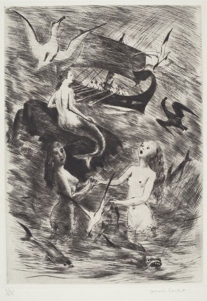Curator: I’m struck by the vulnerability emanating from Marc Chagall’s "The Bird Wounded by an Arrow", created between 1927 and 1930. There's a profound sense of suffering, wouldn't you agree? Editor: Indeed. The wounded bird lying prone immediately captures a melancholic mood. The monochromatic medium of etching and ink only enhances that somber feeling. It evokes, at least for me, an overwhelming feeling of despair. Curator: Well, consider the time in which Chagall created this work. Following the Russian Revolution and amidst growing antisemitism, Chagall's identity as a Jewish artist living in exile heavily influenced his work. Perhaps the wounded bird is a representation of collective suffering, of the targeted and marginalized. Editor: I understand that perspective, certainly, the context adds another layer. But I wonder, is the image more about the figure poised above, the hunter, a youthful aggressor holding bow and arrow? Who gets to determine the roles in these violent episodes? Is it not interesting that Chagall places the oppressor as child? Is this naivete or learned behaviour? Curator: That's a valid interpretation. Seeing the hunter as an adolescent introduces a new layer of complexity regarding the innocence and corruption of youth. One must think, however, about the power dynamics and how they play out within systems of oppression and who ultimately benefits. This is, after all, coming out of a very charged political period, perhaps this bird's suffering echoes broader systemic issues of oppression and resistance? Editor: And speaking to your interpretation, maybe Chagall is showing that those cycles of violence begin earlier, or are so pervasive they appear almost natural in our societal landscape. Regardless, it makes one consider the role and the culpability, or perhaps innocence of those participating. I have more questions than answers, certainly! Curator: I find myself lingering with the idea of empathy. As this work reflects the enduring need for resistance in the face of injustice, the symbolism becomes increasingly important. Thanks for sharing your reading; this allows a broader range of inquiry. Editor: Thanks to you, too. Art should serve as a conduit for critical discourse; the political history informs our understanding and is a powerful entry point to interpret work such as this.