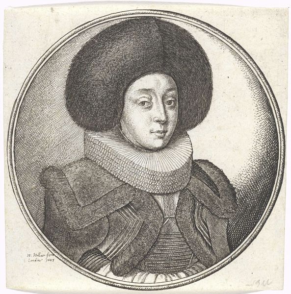 Editor: We’re looking at Wenceslaus Hollar's "Vrouw met stijve plooikraag en grote bontmuts" from 1643, housed in the Rijksmuseum. It's an engraving. Honestly, that collar looks incredibly uncomfortable. What's your take on it? Curator: Oh, but darling, think of it as a statement! This isn’t just some random lady; this is someone announcing her presence. The sheer volume of the fur hat and that ruff, like a pristine, starched halo – it screams status. Hollar was a master of detail; you can practically feel the texture of the fur and the crispness of the linen. Do you get a sense of her personality beneath all that adornment? Editor: I see what you mean about status. Maybe she’s not as uncomfortable as I imagined, just…composed. Is the circular frame significant, or is it just a common choice for portraits of the time? Curator: It's both practical and symbolic, I'd argue. Practically, it focuses our attention, prevents the eye from wandering. But the circle itself… it speaks to completeness, eternity. This isn't just a fleeting image; it's meant to endure, to represent something lasting about this woman and her position. It's like she's encased in amber. Hollar is not just depicting, he's making an assertion, crafting her image, literally. What kind of woman do you imagine she is? Editor: Someone powerful, definitely. And very aware of how she looks. I didn’t expect to get so much from just one portrait! Curator: Isn't it glorious? Hollar manages to distill a whole world into these tiny lines. He gives us a tiny porthole into the past to try and grasp a woman. It leaves you wanting to create your own story about the world she must inhabit, a reflection that's part personal longing. Editor: Absolutely, I’m seeing that now. It's less about the clothing, and more about the character the clothing suggests.