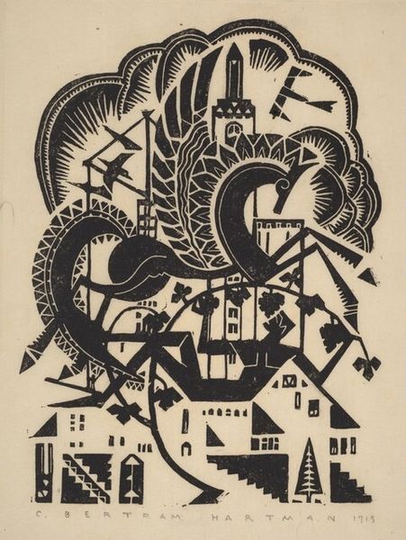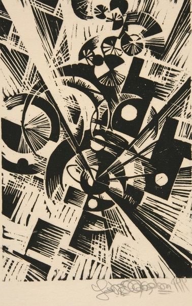 Johannes Molzahn’s ‘Released Energies’ is a linocut print, made by carving an image into a sheet of linoleum, inking the surface, and pressing it onto paper. The stark black and white contrast, and the texture created by the carved lines, give the artwork a graphic punch. Molzahn's sharp angular and geometric shapes, are reminiscent of machinery, conveying a sense of dynamism and modernity. The title suggests an unleashing of potential, perhaps reflecting the rapid industrialization and social changes happening in Europe at the time. Linocut is a relatively accessible medium, associated with graphic design and illustration as much as fine art. The labor-intensive process of carving the linoleum, however, contrasts with the mass-produced imagery it evokes, hinting at the complex relationship between handcraft and industrial production. Considering the material and the making of this print gives us insight into the social and cultural context of the time, blurring the lines between art, craft, and the machine age.