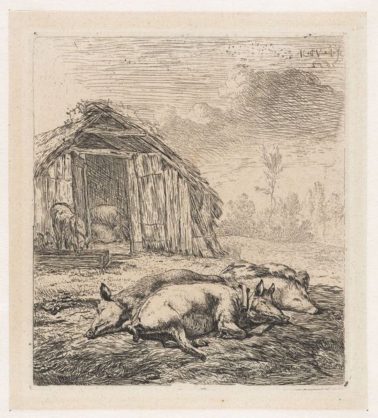 Editor: Here we have Karel Du Jardin's etching, "The Three Pigs In Front of The Pigsty" from 1652. The fine lines create such detail, but also this atmosphere of simple, almost rural contentment. What can you tell me about the history surrounding an image like this? Curator: Well, it's intriguing to see genre painting applied to what some might consider a lowly subject. Du Jardin situates these pigs not merely as farm animals, but as subjects worthy of artistic consideration. How do you think this image functions within the broader visual culture of the Dutch Golden Age? Editor: That’s a great question. Perhaps it was part of a movement to ennoble everyday life, or maybe a subtle commentary on wealth and prosperity, linking it back to the land? The pigs almost seem like they're posing, it seems very intentional. Curator: Precisely. This etching was made for the art market, so that wealthy merchants and members of the growing middle class could buy them for display in their homes. We should ask: does portraying humble subjects make it more accessible or more appealing? What values do you think that they projected? Editor: Interesting... maybe displaying prints like this signaled a sense of groundedness or even social awareness amidst increasing wealth? Is that pushing it too far? Curator: Not at all. It's possible it reflects a curated, constructed view of rural life that helped reinforce social hierarchies while feigning connection to the common person. Remember the socio-political power behind these seemingly simple genre scenes. Editor: That completely reframes my understanding. I hadn’t considered that such a calm scene could be entangled in social dynamics like that. Curator: These images acted in service to class and patronage, as always. It gives a fresh urgency to viewing them.