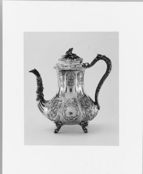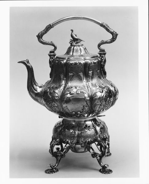 Curator: Looking at this photograph of an elaborate silver milk pot, created between 1848 and 1851 by the firm Ball, Tompkins & Black, now residing at the Metropolitan Museum of Art, I'm struck by its opulent design and the social context it represents. Editor: My initial impression is of pure exuberance. All that ornate detailing, from the floral patterns to the bird perched on the lid—it's a celebration of excess, visually delightful but heavy. Curator: Precisely! Think of the era—the mid-19th century in America. Industrialization was booming, creating new wealth, particularly in urban centers. Objects like this milk pot were not merely functional; they were statements of social status, signs of conspicuous consumption that showed one had truly “made it.” The company who created the item served wealthy Americans eager to display their success through fine household goods. Editor: The bird atop, then, becomes more than decoration. Birds have often been used to signify freedom or divinity in different cultures. Its prominent positioning tells me that it's perhaps intended to signify wealth, status, and the upward mobility that was increasingly available to Americans in that period. Curator: An interesting interpretation. From my point of view, such overt displays of wealth could also have provoked resentment in a society increasingly divided between the haves and have-nots. Such intricate designs of luxury items were made accessible because of America’s industrial advancements but attainable by very few. The political message conveyed by commodities must have resonated with citizens then, as now. Editor: And even without consciously understanding its place in that social and economic tapestry, someone interacting with the piece likely responded viscerally to that density of visual information, and that excess would then affect your perception. So even the simple act of sharing milk from the pot became something larger than that, a ritual with deeper connotations, and a status symbol to admire. Curator: That’s well observed, and I'd suggest this photograph freezes a moment in social history, inviting us to question the values and power structures embedded in seemingly simple objects. Editor: Absolutely. The image then invites one to examine one’s relationship with objects, class and desire as relevant themes in our present lives, regardless of period and origin. Thank you. Curator: Thank you, a perspective vital in how we regard historical art.