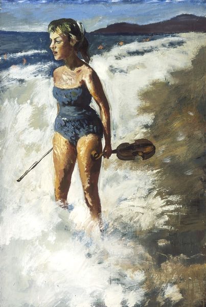 Editor: Here we have Arsen Savadov's "Gimn of Poseidon," painted in 2016, using oil paint. It has such a strange, dreamlike quality. What do you make of it? Curator: Well, I see a powerful commentary on cultural appropriation and the commodification of mythology. The figure, a Pierrot-like character playing a sea-shell horn, seems to embody a forced or performative connection with nature. Editor: Performative, how so? Curator: Consider the stilts, separating him from the natural world, elevating him unnaturally above the waves. Then look at the broken clock and the briefcase half-submerged in the water. What do they represent in contrast to the fantasy? Editor: That makes me think about time and work – like the “real world” encroaching upon a mythological narrative. It is a contrast of traditional myths with current themes... like a disconnect between humanity and its history? Curator: Precisely. Savadov seems to be asking us to examine how we package and consume narratives, especially those connected to identity and place. How does that clash affect your understanding of it? Editor: It makes me rethink the title. It's not a pure hymn; it's critical, almost cynical. Like Savadov is showing that myth, like anything else, can be exploited. Curator: Exactly. It compels us to confront uncomfortable truths about the marketability of culture. This collision can be productive when thinking about contemporary geopolitical and societal influences on our perceived values. Editor: I never thought about it that way; now it seems like there's so much more depth. I'll be looking for that context more in the future. Curator: Exploring the socio-political context of artworks can reveal hidden layers of meaning and promote insightful observations on global themes and narratives.