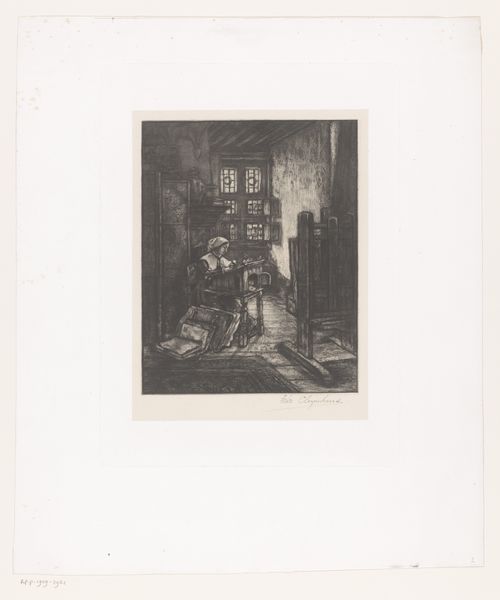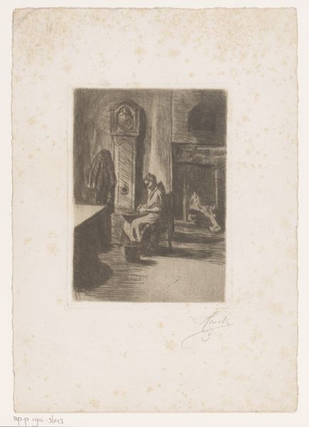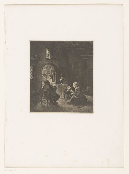 Editor: This is "Boerenfamilie aan tafel in de keuken," or "Farmer Family at the Table in the Kitchen," an etching and print by Angèle Huer, from 1896. It's quite a dark, intimate scene. What do you see in the composition of this piece, Professor? Curator: Immediately striking is the work's restricted palette and the artist's command of light and shadow. Observe how the light source, presumably from the window and the implied hearth, models the figures and articulates the interior space. The tonal gradations achieved through the etching process lend a sense of depth. The figures themselves are arranged within a compact, almost pyramidal, structure, lending stability to the domestic scene. Do you find any formal qualities of particular interest? Editor: I notice how the fireplace, table, and window frame create a series of rectangles, like frames within a frame, drawing my eye deeper into the scene. Is there any intention behind it, or could it be happenstance? Curator: It is deliberate. This nesting of geometric forms creates a spatial layering, contributing to the sense of enclosure and intimacy. The artist manipulates perspective, using orthogonal lines and atmospheric effects to enhance the illusion of three-dimensionality on a two-dimensional surface. Notice too the contrasting textures achieved through varying densities of etched lines. Editor: It's interesting how much information can be conveyed with such simple forms and monochrome tones. The structure really does reinforce the subject's intimate tone. Thank you! Curator: Indeed. By attending to its formal structure and the artist's manipulation of light and texture, we arrive at a deeper appreciation. An aesthetic encounter invites careful consideration.