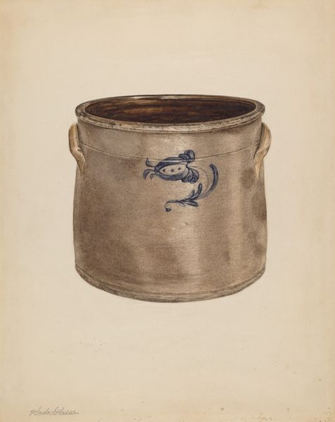 Editor: So, this is Charles Henning's "Toleware Sugar Bowl," created around 1940. It’s a watercolor drawing, and I’m immediately drawn to the earthy color palette. It feels so warm and inviting, almost like a comforting memory. What symbolic layers can you uncover in this piece? Curator: Well, first, consider the sugar bowl itself. Historically, sugar was a precious commodity. What does that tell us? The bowl represents not just sweetness, but also prosperity and even social status. Editor: That makes sense. So, the bowl isn't just decorative; it speaks to broader societal values. Curator: Exactly. And look closer at the floral motifs. Do they seem generic, or can you see something specific in the way they are rendered? Editor: I see… they're not botanically accurate, but they suggest a sense of growth and perhaps the domestic sphere. Are they common motifs? Curator: Precisely. These stylized flowers connect to a long lineage of folk art and decorative arts, celebrating nature within a controlled, domestic environment. Notice how the artist simplifies the floral forms, distilling them into essential shapes and colors. The yellow ribbon shapes below feel joyful and spontaneous. It connects us back to rituals around hospitality and domestic comfort. Can you feel that in the image? Editor: I can. So, it is a simple object depicted with thoughtful intention to evoke collective ideals around home and hearth. Curator: Yes, precisely. We see in it echoes of a simpler time, where small, beautiful things were deeply valued. Editor: Thank you for enriching my view. Now I see this painting less as a mere illustration and more as a symbolic gateway to our shared cultural memory.