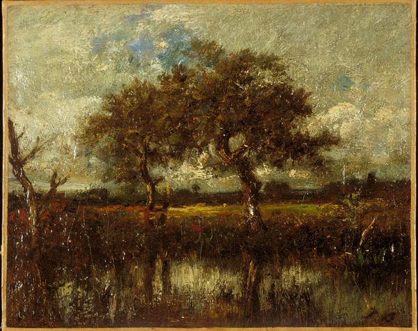 Curator: Welcome. We are standing before "Le Marais," an oil painting by Camille Corot, dating from around 1870. Editor: Immediately, I'm struck by the overall tonal unity, almost monochromatic in its limited range of greens and browns. It feels like a hazy memory. Curator: Note the vertical thrust of the trees mirrored in their reflections, the misty atmosphere achieved through delicate brushwork. The structure offers a masterclass in composition, directing the eye from the shadowed left to the sunlit buildings in the distance. Editor: Trees reflected in water carry symbolic weight, speaking of hidden depths, subconscious landscapes, perhaps even mirroring of the human soul. This whole painting evokes a sense of being in between worlds. Is it a real place or somewhere half-remembered from a dream? And is the bovine at peace or caught off guard? Curator: The beauty lies in the interplay of light and shadow, and the almost photographic detail—notice the precise rendering of the reflections on the water’s surface and how he evokes form using just tone and color. This, combined with that very evident horizon line in the back makes the foreground very interesting to me. Editor: Absolutely. Also interesting to consider: the solitary figure. In a work this evocative, figures often stand for aspects of ourselves, or reflect a journey into introspection or even grief. It all hints to this notion of fleeting moment. Curator: And so, we see how Corot uses the tools of paint and light to construct not just a landscape, but also a powerful evocation of memory, an insight in visual structures. Editor: Yes, a journey through external imagery that unearths so many emotional reflections that have settled through the cultural imagination across time. It feels archetypal, universal.