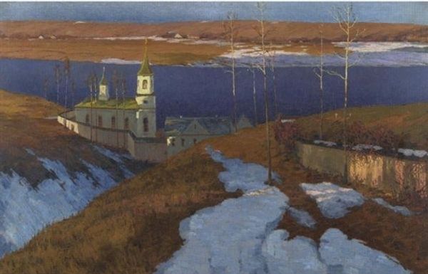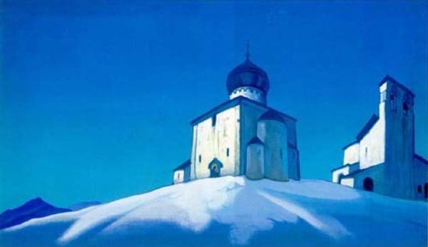 Nicholas Roerich made this painting of Ancient Novgorod, or The Saviour Nereditsa, we don’t know exactly when, but what strikes me first is the way he uses colour to create atmosphere. The palette is muted, almost monochromatic, evoking a sense of stillness and historical weight. It's the kind of painting where the process feels very present, like you can see the artist making decisions in real-time. The surface has a wonderful texture, not too slick, not too labored. Roerich’s use of thin layers allows the underpainting to peek through, adding depth and complexity. Look at the blues in the sky and dome – they shift and vary, creating a subtle sense of movement. Then see how the white walls of the church are tinged with pink, which makes this monument feel warm and alive. Roerich’s work reminds me a little of Milton Avery, in the way both artists distill landscapes to their essential forms. Ultimately, it is a piece that invites contemplation, reminding us that art is always a conversation across time.