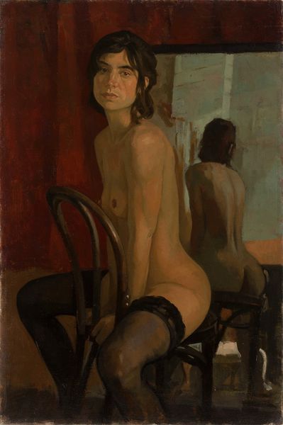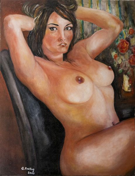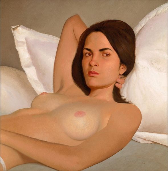 Neale Worley’s oil painting presents a nude female figure reclining in what appears to be an artist’s studio. The composition is dominated by the figure, whose pale skin is rendered with subtle gradations of light and shadow. The overall palette is muted, with warm browns and creams contrasting with the darker tones of the draped fabric. The painting explores the interplay between the artist, the model, and the viewer. The woman's gaze meets ours directly, challenging traditional notions of the objectified nude. Worley uses a combination of loose brushstrokes and careful attention to detail, creating a sense of immediacy and intimacy. The setting, a cluttered studio, further complicates the narrative, suggesting a space of artistic production and self-reflection. The formal structure, with its emphasis on light, form, and composition, serves to destabilize established meanings around representation, inviting a reconsideration of the relationship between artist, subject, and audience.
