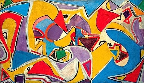 Here we have Picasso’s ‘Studio’, made with oil on canvas, though when, exactly, is anyone’s guess, really. I find his paintings so interesting because of the way he simplifies form, breaking things down into their most essential shapes and colors. You can see it’s not about illusion, but about inventing a new kind of picture-space. There’s a playfulness in the materiality here, a flatness that almost feels like collage, even though it’s painted. The textures are smooth, the colors bold and declarative, and the layering creates a shallow depth that keeps you right up front. I keep coming back to the way he renders the figures, like geometric puzzles, but still so human. And look at that little green circle inside the triangle – such a small detail, but it animates the whole composition! It’s like he's winking at us. This makes me think about the work of Stuart Davis, actually, another artist who was really good at building up a world of shape, color, and language. I think it shows that art is a conversation that’s always evolving, always questioning what a picture can be.