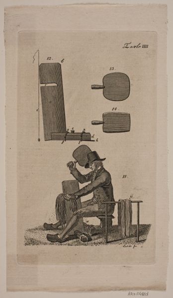 Anne Claude Philippe Caylus created this print titled 'Knife Sharpener' at an unknown date, using etching. It encapsulates the social fabric of 18th-century France through its depiction of a common tradesman. The image presents a knife sharpener, presumably from Auvergne given the inscription "Gagne petit Auvergnat," engaged in his labor. This print provides insight into the working class and their daily lives. Caylus, himself an aristocrat, presents a romanticized view of the working man. This image is a typical character study, reminiscent of others produced at the time by the French aristocracy. Institutions such as the French Royal Academy encouraged such imagery that emphasized social hierarchy. To truly understand this artwork, one must delve into archival records, social histories, and even literary sources that describe the lives of ordinary people in 18th-century France. This method allows the art historian to contextualize the work within its original socio-economic framework.