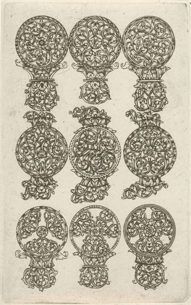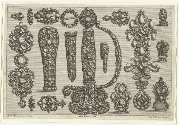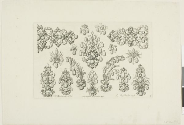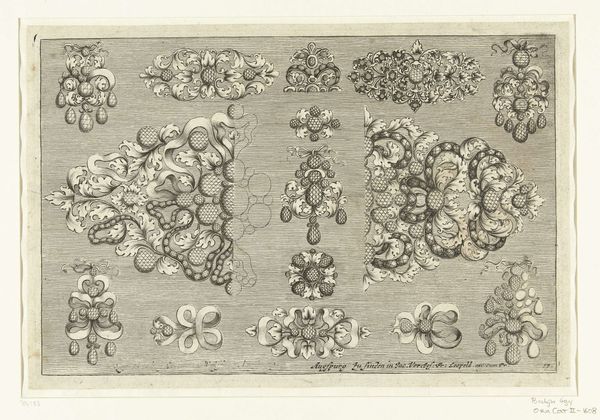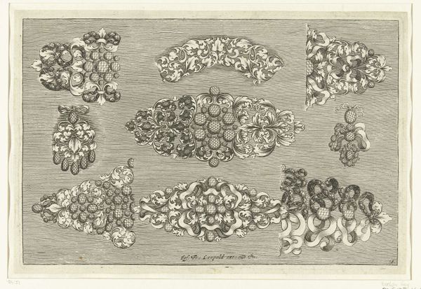 Joseph Friedrich Leopold created these ten jewelry designs on paper using etching in the late 17th or early 18th century. Such designs offer a glimpse into the world of artisans catering to the wealthy during this period. The visual language speaks of Baroque exuberance. Leaf motifs and swirling ribbon patterns would have resonated with the aristocratic class, keen to display their wealth through fashionable accessories. Leopold's image also offers insight into the institutional history of art production. Printmaking allowed for the widespread dissemination of designs, influencing trends and standardizing artistic styles. The social conditions of the time heavily influenced artistic output; these designs reflect the hierarchical structure of society, where luxury goods were predominantly enjoyed by the elite. By analyzing sources such as fashion plates, inventories, and guild records, historians piece together a deeper understanding of the society that shaped these works of art. Studying this etching reminds us that art's meaning is always contingent on its social and historical context.