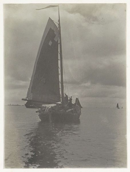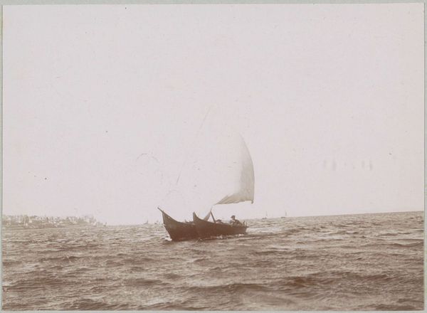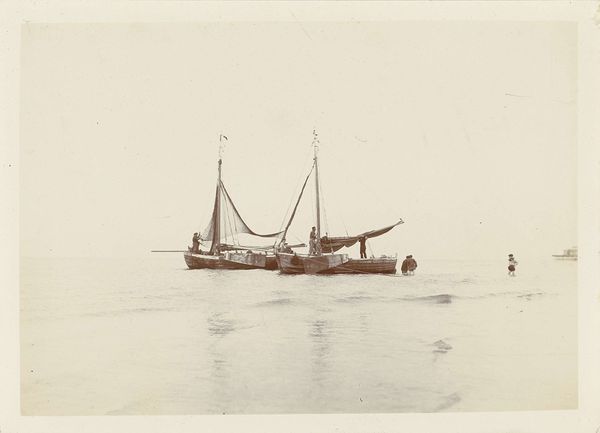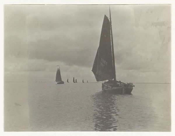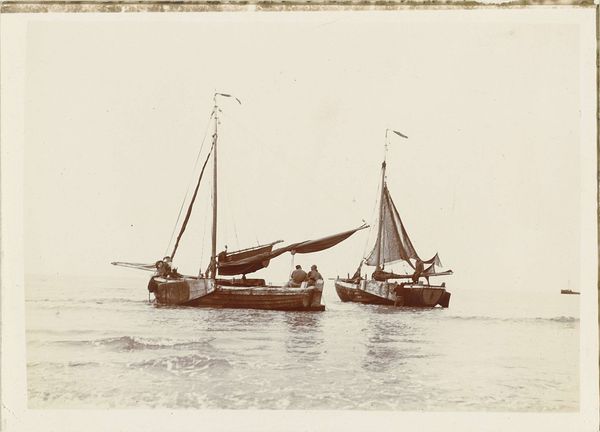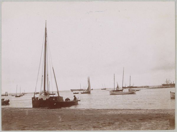 This photograph by Delizy shows six people in a sailboat, possibly near Le Moulleau in Arcachon. In the absence of a precise date, we can still consider the social and cultural context of leisure and photography at the time. The late 19th and early 20th centuries saw the rise of photography as a medium accessible to a broader public, coinciding with the growth of leisure activities among the middle classes. This image, with its sepia tones and snapshot aesthetic, suggests a moment of informal pleasure. How does the act of capturing this scene reflect the social values and aspirations of the time? Was it a conscious effort to document a moment of bourgeois leisure, or something else? Further research into the history of photography, leisure, and social class in France could provide insight into the cultural significance of this image. The meaning of art is always contingent on social and institutional context, and historical understanding can reveal its deeper significance.