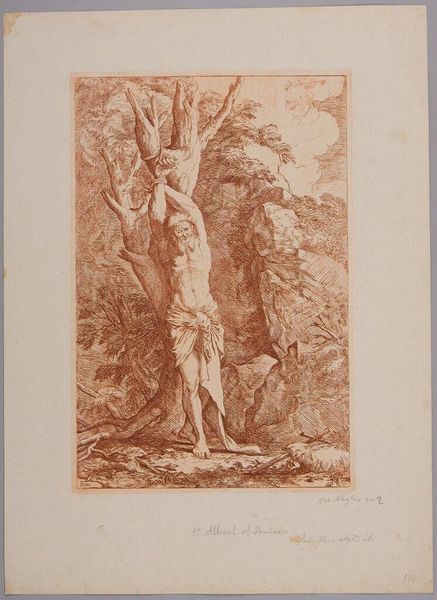 Curator: This etching by Salvator Rosa is titled "Albert, Companion to Saint William." It presents a rather stark and vulnerable figure. Editor: Yes, there is a raw, almost unsettling quality. The figure's emaciated form and the barren tree contribute to a sense of suffering. What can you tell me about the artist's method? Curator: Rosa was very interested in the physical act of producing images. The etching process allowed for the easy dissemination of his images to a wider audience which helped to spread his artistic vision. Editor: The stark contrasts created through the etching process also lend it a dramatic flair, highlighting the contours of the body and the textures of the natural setting. Ultimately, it makes you feel something. Curator: I'm inclined to agree; the print's material existence as well as its availability really helps to amplify that connection with its viewers.