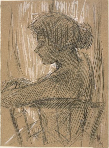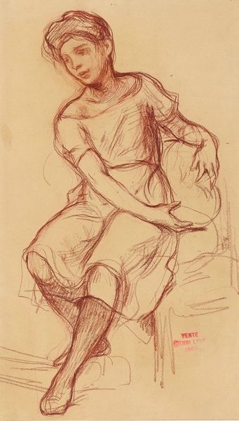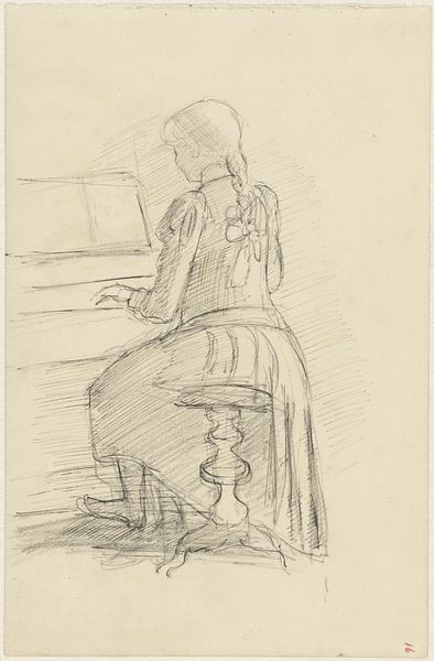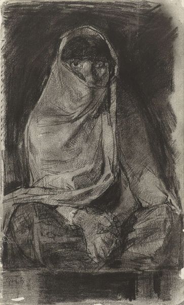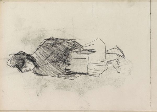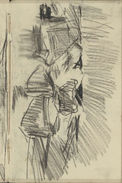 Curator: Let’s spend some time with this drawing by George Hendrik Breitner, titled "Vrouw op een bank," which roughly translates to "Woman on a bench." Breitner likely executed it sometime between 1873 and 1923. Editor: It has a hazy quality. The heavy pencil work gives it a transient and melancholy feel; almost like looking through a fogged window. Curator: Indeed. The loose strokes are typical of Impressionist explorations of light and form. Yet it would be an error to confine Breitner to this label. In viewing this figure we need to take account of how turn-of-the-century artistic milieus framed women— particularly in terms of class, agency, and representation. How does this relate to earlier art history when paintings of bourgeois or aristocratic women presented very different cultural symbols? Editor: Focusing on purely visual aspects, what grabs me is the figure's composition within the space, in particular how he's used these dark, almost oppressive pencil lines around her head to frame it and pull us into this moment. Note also that the figure is almost unfinished around the face - Breitner focused the strongest line work around the figure's posture and dress and the background that gives an overall weight to the scene. Curator: Precisely. Look closer. See the social position Breitner negotiates in sketching a woman within what appears to be domestic interiors. Consider her downcast posture, and think about how his drawing participates in larger cultural debates. Is the artist exploring new conceptions of feminine psychology? Editor: Perhaps. But these rough pencil strokes and erasures reveal an intense working process; the sketchy quality reveals Breitner's interest in capturing an immediacy, the flux of light and shadow, more than constructing some ideal or preconceived symbol. Look at the confidence of some lines versus others. It makes it interesting from a pure art point of view! Curator: Right. To engage with Breitner's formal techniques invites discourse to open the meaning into conversations about his intentions, biases, and cultural conditions of art making. A balance is important. Editor: Indeed. Both close visual reading and broad contextual knowledge are crucial if one is to unpack "Woman on a Bench".