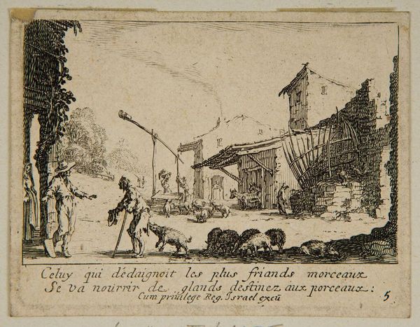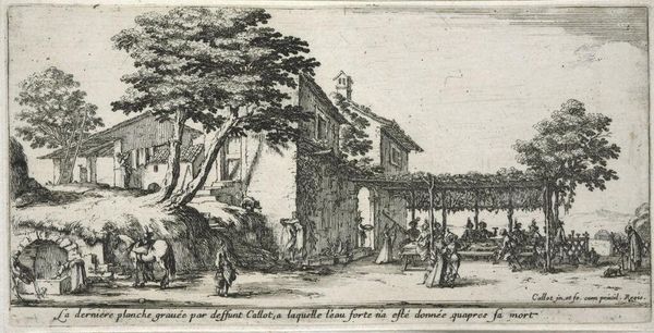 Curator: This etching by Jacques Callot, titled "Killing the Fatted Calf," plunges us into a bustling biblical scene. It resides here at the Harvard Art Museums. Editor: It's intensely alive, isn’t it? Like a frozen moment teeming with chaotic energy – all those angled lines giving it a sense of urgency. Curator: Callot masterfully uses line to create depth. The architectural elements and figures fade subtly into the background. Editor: Yes, and the subject matter is fascinating. Such violence at the center, yet the overall impression isn't gruesome, but strangely celebratory. It makes me think about returning home, and the sacrifices we make for those we love. Curator: Perhaps Callot sought to capture the complex emotions inherent in the parable—joy, redemption, even a touch of brutality. Editor: Exactly! I hadn't considered the brutality, but now that you point it out, it’s very evident. Thanks! Curator: An etching like this is as much about the narrative it tells as it is about the artistry of the line itself. Editor: I’ll remember that.