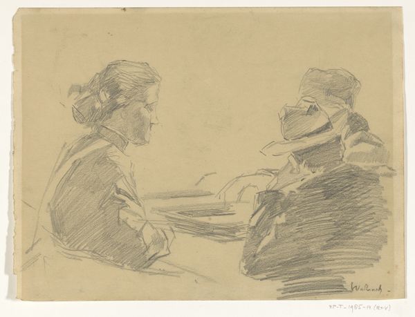 Albert Neuhuys made this drawing of a man and woman at a table sometime before 1914, using a humble pencil on paper. The lines are tentative and sketchy, giving the impression of a scene quickly captured. But think about this scene, a man and woman sitting together, probably working. What kind of labor were they engaged in? The careful strokes suggest observation of working people, perhaps in a rural setting. The simple materials - pencil and paper - mirror the everyday life depicted. This wasn't about high artifice; it was about documenting the dignity of labor. Neuhuys has allowed the texture of the paper to remain visible, a constant reminder of the work involved in creating the drawing, and equally a reminder of the work that the sitters are undertaking too. So next time you see a simple sketch, remember the power of humble materials to tell complex stories about labor, class, and the human condition. It challenges our traditional art categories and makes us think about the process behind artmaking.