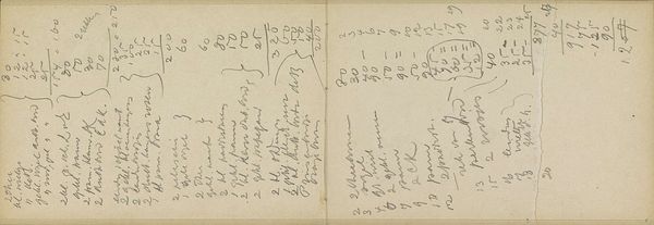 Editor: Here we have "Annotaties" by Willem Witsen, likely created between 1888 and 1891. It's an ink drawing on paper, and it looks like a page from a personal sketchbook filled with numbers and notes. What strikes me is its seeming randomness. How do you interpret this work? Curator: This isn't random at all; it’s a glimpse into Witsen's artistic process and, by extension, the creative struggles many face, especially women and artists of color who historically were denied resources. Look at it as a subversive act. How many opportunities were given to him to just explore his potential? I see him taking ownership of his space, recording, and perhaps experimenting. Does this make you reflect on institutional privilege at all? Editor: I see what you mean. The simple act of keeping a sketchbook, something we might take for granted, becomes a statement about having the freedom and resources to create. It reminds me of critiques about whose voices and perspectives are historically valued. Curator: Exactly! We need to consider that the lack of sketchbooks like this from other marginalized communities throughout the late 19th century wasn't necessarily a lack of interest. More than likely it reflects systemic barriers that kept people from equal access to paper, education, or even safety in expressing themselves. Consider, also, how Impressionism, of which Witsen was part, sought to capture fleeting moments and personal experiences. The mundane—numbers, calculations—elevated. Editor: So you’re saying this page isn’t just a collection of jottings but evidence of a very personal rebellion through mark making. It represents claiming a space. I guess I initially viewed the notes as purely practical, devoid of deeper significance. Curator: I like the phrase “personal rebellion”. Considering his relative socio-economic advantage and historical context helps us dig beneath a surface impression. Do you find yourself questioning its simplicity? Editor: Yes, absolutely. It shows how looking at art through an activist lens uncovers these hidden stories and helps us understand both the art and its socio-historical underpinnings. Curator: Indeed! Always ask 'Who gets to create and whose creations do we get to see?'