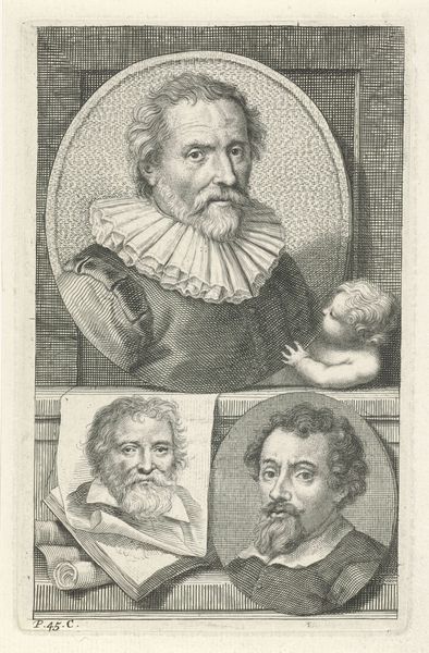 Editor: Here we have Jan l' Admiral's "Portretten van Hendrik van Steenwijck, Jacob de Gheyn en Sebastiaan Vranx," an engraving from 1764. It's quite fascinating to see three portraits together like this. What stands out to you most when you look at it? Curator: Well, focusing on the materiality, notice the incredible detail achieved through the engraving process. Think about the labor involved, the skill in manipulating the metal plate, and the societal function of prints like this. It's not just about capturing likeness; it's about circulating images, making art and knowledge accessible, and building artistic communities through shared visual language. Editor: So, you are thinking less about the artistry in portraying them but how the choice of this process makes it accessible? Curator: Precisely! The engraving process is itself a choice laden with meaning. Unlike painting, engraving allows for reproduction and distribution. The choice of portraying these figures within what looks like individual portrait frames within a larger scene points towards the mechanization and commercial exchange of artistry at the time. What kind of socioeconomic factors played a role in Jan l' Admiral using the engraving method rather than other artistic methods to create this image, for example? Editor: I never considered it that way. That reframing makes the engraving method part of a social narrative. I am thinking about labor and materials more deeply than before. Thanks! Curator: Exactly! Examining the labor of creation invites inquiry into production, reception, and art's overall position in culture.