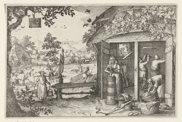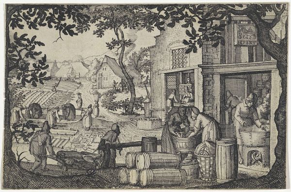Matthäus Merian the Elder rendered this work with pen and brown ink, heightened with white and gray wash. The sepia tones of the ink emphasize the earthiness of the scene. Look at the figures harvesting apples. Some are in the tree, while others collect the fallen fruit into woven baskets. Then notice the laborers transporting barrels, likely full of cider, on a wooden cart, showcasing the labor-intensive processes of agriculture in the 17th century, as well as the reliance on materials like wood. This drawing highlights the deep connection between people and the land, but also reveals the division of labor inherent in the cycle of agricultural production. The use of humble materials to depict this scene reminds us that art can be found in the everyday. It underscores the importance of considering the broader context of labor and the social dimensions of craft.