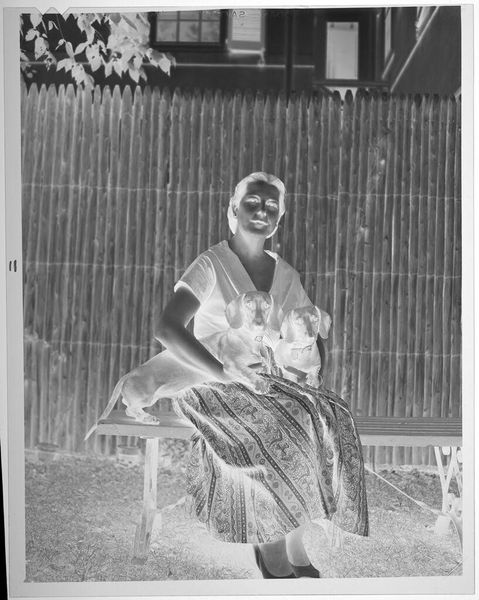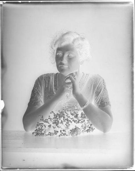 Curator: This is an Untitled portrait by John Deusing, currently held in the Harvard Art Museums. The work presents an older woman in a patterned dress. Editor: Immediately, I'm struck by the contrast. The delicate floral patterns of the dress clash so interestingly with the woman’s stoic expression. It gives the work an odd, almost eerie feel. Curator: The piece invites reflection on representation, aging, and the social constructs around femininity. Note how her jewelry and dress signify status, yet the photographic inversion obscures clear readings. Editor: It's like a dream... or a memory fading. What stories are held in those eyes, and how do we, as viewers, project our own narratives onto her image? I find this image unsettling in a powerful way. Curator: Exactly. Deusing's work asks us to question our assumptions, prompting us to consider the lives and experiences of women beyond simple aesthetics. Editor: It's a ghost of a portrait, really! Haunting, beautiful, and full of questions. A perfect piece for rumination, I'd say.