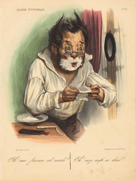 Editor: This is Honoré Daumier's "Le vrai Fumeur," a lithograph from 1836. It looks like a caricature, but the softness of the smoke and the sitter’s face also make it oddly serene. How do you read this work, focusing on its structure and form? Curator: The lithograph commands attention through Daumier's adept manipulation of line and tonal gradations. Notice how the sinuous curves of the smoke contrast sharply with the geometric forms of the pipe and table. Consider the semiotic interplay of these contrasting elements, perhaps symbolizing the tension between the fleeting pleasures of smoking and the solid constraints of bourgeois life. What is your read of how color is working here? Editor: I see! The limited palette—mostly earth tones—contributes to the sense of groundedness, but the almost ghostly smoke is rendered with pale blues, so there is the visual tension of a desaturated color contrasting against warm ones. Curator: Precisely. Note, too, how the formal qualities of the shading contribute to the volume of the subject's figure. How do you see that shape interacting with the lines of the composition? Editor: The curvature and the rounding, along with his half-closed eyes and the plume of smoke above his head, give me a sense of languor. His pose looks very relaxed, doesn't it? It's interesting to contrast his comfort against the geometric shape of the table. It's interesting how that interplay between those compositional devices creates a visual narrative here. Curator: Indeed. The materiality of the lithographic print allows for a subtle modulation of tone. Thinking structurally, what impact do you feel that has? Editor: That textural effect creates an atmosphere. I never really considered how texture could have its own function here, not just being an artifact of the material. I’ll definitely be more attentive to those subtle differences from now on!