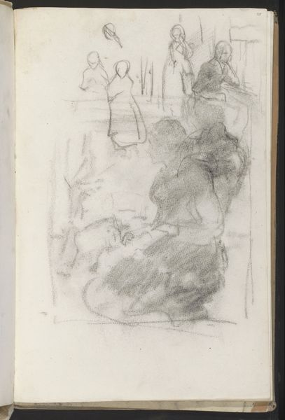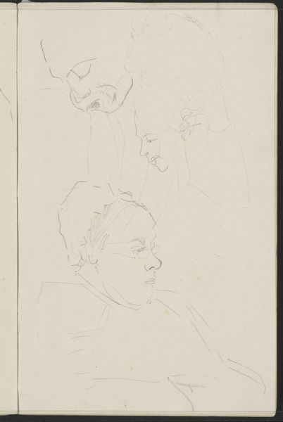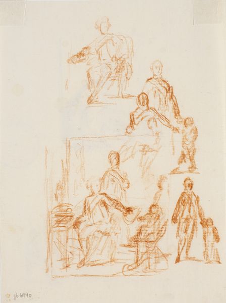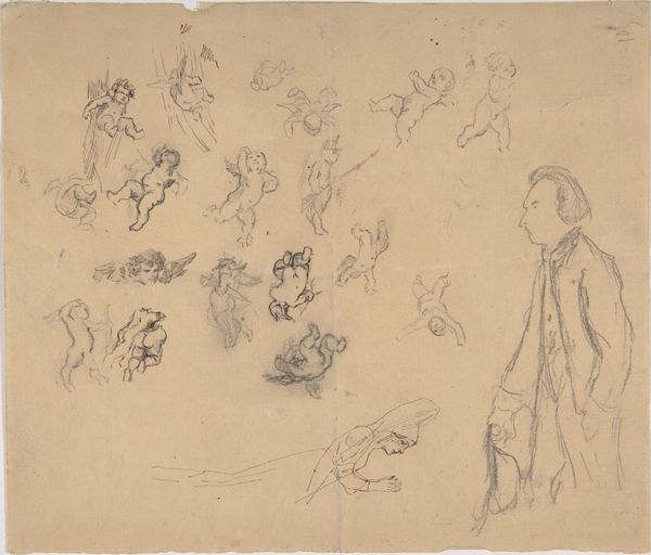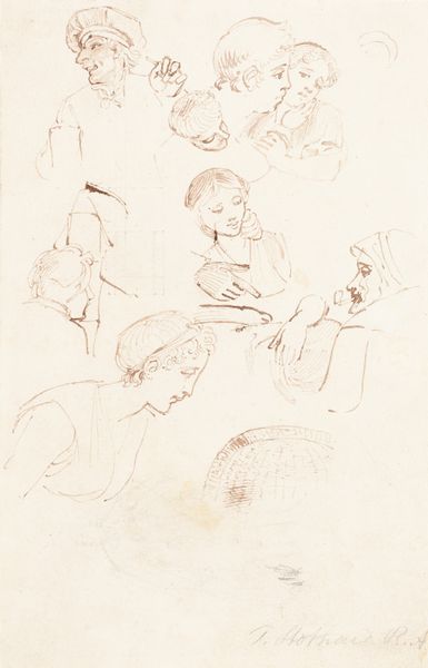 Curator: Here we have a sketchwork by C.A. Lorentzen called "Skitser til maleriet af W.A. Műller, Kunstakademiet, samt en lille figurskitse," dating back to the period of 1746-1828. It’s currently housed at the SMK, the National Gallery of Denmark. What are your first impressions? Editor: Chaotic, in a way that feels almost comforting? It’s like peeking inside someone’s very busy but organized mind. Lots of nervous energy captured in pen and ink. Curator: Absolutely. Lorentzen has used ink on paper to capture several studies, predominantly focusing on portraits. The composition is fascinating because of its seeming disorder—yet, each sketch possesses an undeniable structural integrity. Notice how the repetition of the figure, even in fragmented form, creates a rhythm. Editor: It does give it a strange unity, doesn't it? The way the artist repeats similar poses allows one’s eyes to wander across the paper in a sort of dance, picking up nuances with each return. I find it also adds a playful element, like the figures are caught in multiple, overlapping moments. A time lapse of his sitter. Curator: Exactly. It is very likely that it acted as an aid to his finished portraits. The academic style lends itself to this kind of preparatory work, as it involves the need to fully understand a model prior to working on canvas. What semiotic elements can you discern? Editor: Well, the recurring pose—the sitter’s posture—it certainly conveys a sense of authority or learnedness, typical for academic portraits, even within a sketch. And the sketchy style underscores its primary intention, to create some visual reminders instead of being an autonomous artistic artifact. The sketch also appears very efficient, the bare minimum details are given to each visual component to effectively assist in its goal of representation, there is also a sense of vulnerability in the naked figures. Curator: Interesting. The artist also employs an excellent balance between positive and negative space. This allows for our mind to fill in the missing links and join him in a sort of intellectual exercise. Editor: It’s definitely an intimate view. It's like being invited to collaborate with the artist. I find it so easy to identify and get a feeling of companionship from sketchworks, unlike more finished portraits. Curator: Precisely! In looking at Lorentzen’s sketches here at the SMK, what is truly enchanting is how they become windows to his artistic process and offer this beautiful intimacy that you noted. Editor: Well, I'm leaving with the sensation of having spent time in a creative sanctuary, where ideas are born. It is very uplifting.