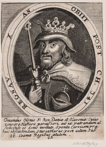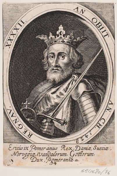Editor: Here we have "Kong Erik II," an engraving from 1646, currently held at the Statens Museum for Kunst. It has an austere quality about it, wouldn't you say? Given the inscription, the artist’s attention to detail and the regal symbolism in this print, I'm wondering, what does this image say about the representation of power in 17th-century Denmark? Curator: Well, first, let’s think about why this print even exists. Who was the intended audience, and what was the function of circulating images of long-dead kings? Editor: Perhaps to legitimize current rulers or establish a historical narrative? Curator: Precisely. The engraving format itself speaks to a broader distribution than a painted portrait, making this a powerful tool for disseminating a specific image of Danish history. Note the inclusion of text - accessible to a learned, probably aristocratic, audience. How does that relate to your thoughts on power? Editor: The text would provide historical context and reinforce the image's authority, perhaps? I mean, seeing is one thing but reading solidifies that this is real. Curator: Indeed. The printing press allowed for a carefully constructed narrative, blending image and text, to influence public perception of historical figures and, by extension, the current sociopolitical order. Who "owns" the story, who can circulate it? Editor: That's fascinating; it highlights how images were deliberately crafted to reinforce existing power structures. It makes you question everything, doesn't it? Thanks for opening my eyes! Curator: My pleasure! It shows how art exists in dialogue with broader cultural and political forces. There are messages embedded in everything if we only knew how to listen!