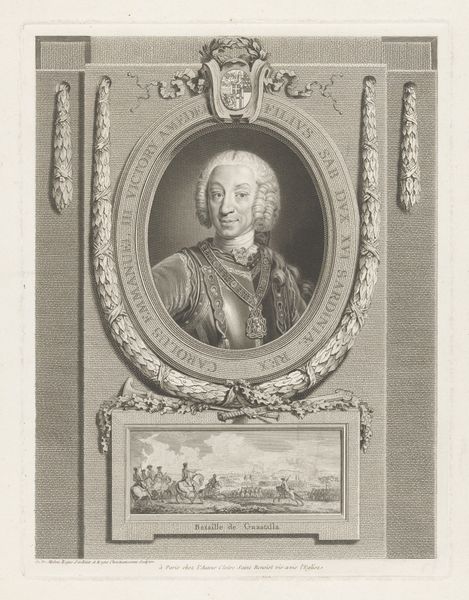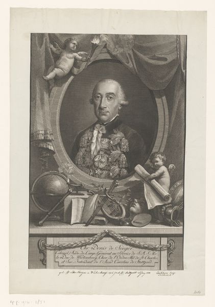 This is Johann Georg Wille’s "Portret van Ulrich van Löwendal", made with etching, burin, and paper. The print presents a portrait of Ulrich von Lowendal, a military figure, encased within an elaborate oval frame. The composition is structured around symmetry and classical motifs. The texture is achieved through fine, intricate lines, creating subtle gradations of light and shadow that lend the portrait a palpable sense of depth. The oval frame is decorated with floral ornaments, emphasizing the figure's importance. Below, a cherubic figure places a crown on a coat of arms, further symbolizing status and power. Wille's attention to detail not only captures the physical likeness of Lowendal but also engages with broader philosophical notions of identity and representation of power. In this sense, the print not only memorializes an individual but also examines the semiotic systems through which authority and identity are constructed and communicated. The print serves not just as a record but also as an active participant in the cultural discourse of its time.