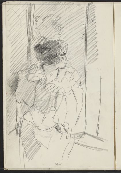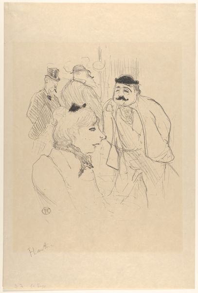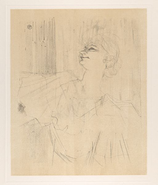 Editor: Here we have Toulouse-Lautrec's "I. Sur la Scène" from 1898, a lithograph in pencil and crayon. There's such a sense of immediacy to it, like a quick sketch capturing a fleeting moment. What do you see in this piece? Curator: The sketch-like quality, as you observed, belies its complexity. Lautrec masterfully employs line and shadow to convey the cultural nuances of Parisian nightlife. Consider the central figure. Her upward gaze speaks volumes. Is it defiance? Longing? Discontent? The symbol of the upward gaze itself echoes through religious art across millennia. Editor: That's interesting, I hadn't thought of it in terms of those grand themes. Curator: Indeed. Notice, too, how her dress slips off her shoulder, and consider how this echos in mythology: revealing just a touch of flesh was frequently code for the hidden depths. Are we glimpsing her vulnerability, or her willingness to use it? Now, look at the man on the left. What do you think his figure represents? Editor: Perhaps an admirer... or maybe something less benign? There is something unsettling about him lurking in the shadows. Curator: Precisely! Lautrec understood the power of suggestion, of what's *not* explicitly shown. His art, much like Japanese Ukiyo-e prints, uses these kinds of symbolic compositions and representations to evoke emotions and hidden narratives within the social milieu of fin-de-siècle Paris. This sketch captures a coded story far deeper than just a portrait on the stage. Editor: It makes me appreciate how symbols that repeat throughout time continue to impact our subconscious. Thanks for showing me all the embedded symbols. Curator: Indeed, it shows us how history, culture, and psychology become inextricably linked within the visual language of art.
