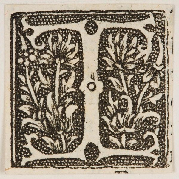 Curator: Here we have an intriguing artwork from the Harvard Art Museums, simply titled "Letter I," by an anonymous artist. Editor: Immediately, I see a garden of the mind, where letterforms bloom amidst thorny complexities and blossoming potential. It makes me think of illumination. Curator: Indeed! The letter itself serves as a stark, almost architectural foundation for this wild, organic growth. The contrast is striking. What do you make of all those tiny dots? Editor: Ah, the stippling! A texture of dreams. It speaks of medieval woodcuts and illuminated manuscripts, the kind of visual language where every tiny element carries meaning, like the dots in a Seurat painting. Curator: Do you feel that those floral motifs evoke particular stories? Editor: Perhaps a story of emergence. We see leaves unfurling, buds about to burst—a visual metaphor for knowledge itself blossoming from a single idea, the "I" as the seed. Curator: So, from initial impression to symbolic resonance, it's a captivating journey. Editor: Absolutely. It shows us that even the simplest form can contain worlds.