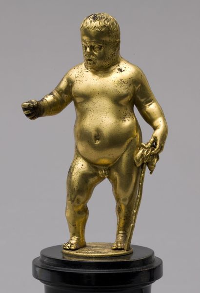 Editor: Here we have Giambologna's bronze sculpture, "Bacchus," created sometime between 1580 and 1608. The figure is… striking, to say the least. The god of wine, but almost cherubic. What symbolic meanings are embedded in its creation and the decision to depict the god of wine in such a corpulent style? Curator: Ah, Bacchus! A figure drenched in symbolism, not just as a deity of wine, but as a conduit to ecstatic liberation. Notice the fullness of the figure, it isn’t merely corpulence; it is abundance, the fertile generosity of the earth made manifest. His body, as a vessel, literally and figuratively embodies overflowing plenitude, the very spirit of wine he embodies. How does that visual weight contrast with, say, classical portrayals of idealized athletic figures? Editor: It definitely goes against those classical ideas! I guess I’m used to seeing Greek gods portrayed with more, shall we say, restraint? This feels deliberate, an almost defiant rejection of those earlier styles. Curator: Precisely! This deviation reflects a Mannerist sensibility, where artists consciously distorted proportions and embraced artifice. But what does this specific image signify? I invite you to remember: wine, intoxication, and ecstasy are disruptive forces – social conventions momentarily dissolved! Bacchus, by overflowing expected boundaries, embodied such societal overturning. He is the "liberator," freeing us to shed constraint. In this sculpture, is Bacchus only the liberator of individuals from restraint? Editor: Hmmm. Perhaps also freeing the artist from artistic constraint? It sounds like Giambologna was consciously breaking with artistic traditions, just like Bacchus breaks with social norms. Curator: Excellent! We’re circling back to understanding the symbol – he also is that. Symbols are never unitary; they weave elaborate threads, inter-referencing and inter-illuminating cultural and artistic memory. Editor: So it's not just about wine; it's about freedom, abundance, and challenging expectations, artistically and socially. I learned a lot – thanks! Curator: Likewise! Thinking about symbols always enriches the experience and cultural meaning, helping make that artistic leap and broaden awareness.