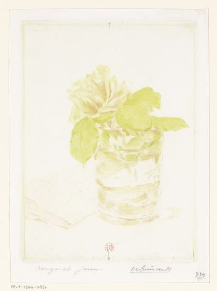 Editor: Here we have Henri-Charles Guérard's "Brief naast een vaas met roos," which translates to "Letter next to a vase with rose," likely made sometime between 1856 and 1897. It's a delicate watercolor on paper, and something about its simplicity feels so intimate. How do you approach interpreting this work? Curator: Well, the material itself speaks volumes. Watercolor on paper, especially in this era, suggests a certain intimacy and accessibility. The choice to depict everyday objects like a rose and a letter draws our attention to the social rituals surrounding communication and domesticity. I see the artist foregrounding both labor and consumption here: paper production, the manufacture of pigments, glass production for the vase... What can all this tell us about class and society? Editor: That's fascinating! I hadn't considered the socio-economic implications of something that appears so straightforward. How does the Impressionist style influence your view? Curator: The perceived spontaneity of Impressionism can obscure the labor involved in producing that aesthetic. These artists, like Guérard, still participated in a marketplace governed by the demands of patrons. Consider what that would mean for this subject. Is the rose simply a beautiful thing, or is its depiction a product responding to market forces and societal desires? Editor: So, instead of seeing a romantic scene, we can also analyze how the artist participated in a consumer culture through the sale of his art. Curator: Precisely! And to what extent did that impact his subject choices and manner of depiction? How does something like that compare to what we might value about "art" today? Editor: Wow, this really shifts my perception. I'll never look at a still life the same way again! It makes you think about how art production and consumption are always intertwined with social structures. Curator: Indeed! Questioning the materials, process, and social context helps us unravel the complex relationship between art, labor, and value.