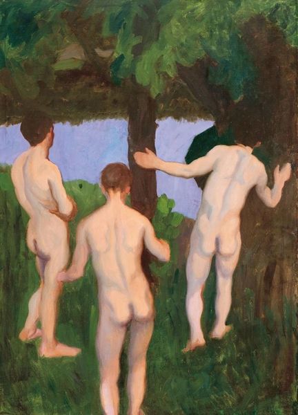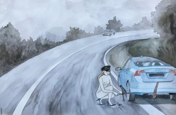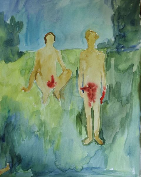 Kinder Album, born in 1982, made this untitled work using watercolor on paper. The fluid, translucent qualities of the paint lend themselves well to depicting the scene's dreamlike atmosphere. The washes of color evoke a sense of hazy light and open space, while the simple lines create a childlike perspective that allows the viewer to focus on the narrative elements: the two figures pulling a large, ambiguous object. The decision to use watercolor, a medium often associated with amateur or beginner artists, could be seen as a deliberate choice to challenge traditional notions of artistic skill and value. By embracing the inherent qualities of the material, Kinder Album invites us to reconsider our expectations of fine art and to appreciate the expressive potential of everyday materials and techniques. This piece reminds us that the true value of art lies not in the complexity of its creation, but in its ability to evoke emotion and spark our imagination.