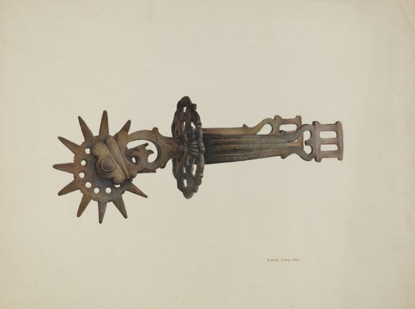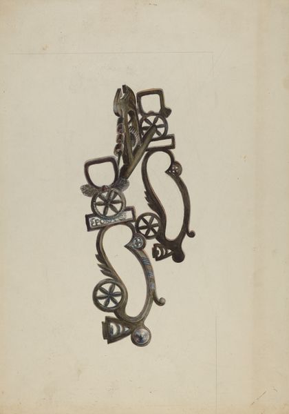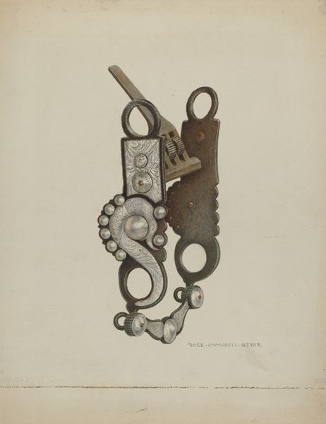Curator: Gerald Transpota, around 1937, meticulously rendered in watercolor and colored pencil. Here is the image “Bit”, a drawing which appears to represent precisely that – part of a horse’s bridle. What catches your eye right away? Editor: The immediate feeling is one of ornate constraint, which is odd given the delicate medium. Curator: Constraint, that's insightful. The piece, focusing solely on the bit, emphasizes control and leverage—the stark mechanics of it. The artist uses watercolor and colored pencil to bring out an impressive amount of detail. What do you think this tight focus achieves? Editor: For me it intensifies the scrutiny. The almost diagrammatic isolation forces a reading of its shapes and connections. Semiotically speaking, the absent horse becomes even more palpable—present only through the imposition of these cold shapes of the bridle bit. The composition denies it grace. Curator: It's interesting that you see it that way, as cold. I look at Transpota’s technique here, the layering of colors, and find it somewhat delicate, perhaps even humane. I mean, I understand the mechanism’s use but here I appreciate more what this image communicates about control and refinement. It feels very grounded and earthly. What's the function of art if not to illuminate function, you know? To render the common uncommonly? Editor: Indeed, there’s tension there between form and inherent use that lends a strange dignity. We see how even something used for perhaps an aggressive purpose is elevated through a kind of considered draftsmanship. Looking at the medium used—colored pencil and watercolor—Transpota isn't going for photorealism but a stylized study. Curator: Precisely. It elevates a utilitarian object, transforming it into something worthy of our observation. Transpota draws our gaze to the elegance in functionality, don’t you think? We almost begin to ignore its true intention, its purpose for existence. Editor: Right, that sublimation from the mundane…I think it brings us into a meditation on not just the bit but art and purpose. We're both maybe acknowledging that its value stems less from function and more from the artistry that calls for a re-examination. Curator: So, maybe its real purpose IS only for the artist’s subjective study, to exist only within a human scale, and not bound to external concepts or forces. I can rest easy knowing it simply represents something that exists outside of me, as another tangible being. Editor: Beautifully put. In the end, “Bit” reflects on more than control; it examines art, context, and our connection to even the most functional items in the world around us.