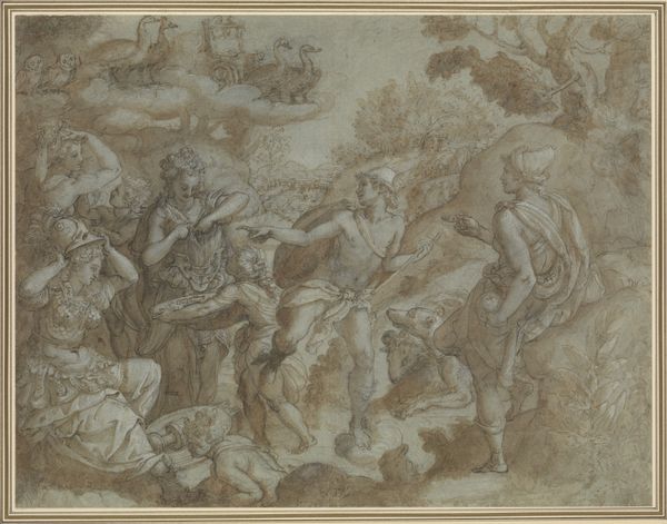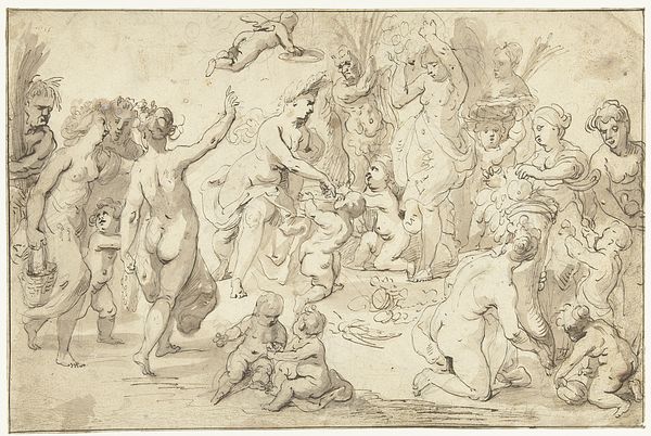 Jacob de Wit created this print, "Four Naked Children by a Garden Vase (Winter)," using etching techniques sometime between 1695 and 1754. De Wit, a Dutch artist, lived during a period of significant cultural and economic change in Europe, when the Dutch Republic was declining and there was a shift towards more international styles in art. The image presents an allegorical representation of winter, a theme that reflects the changing seasons of life and nature, with the figures of children or putti, common in Baroque art, symbolizing innocence and purity. Consider the contrast between the vulnerability of the naked figures and the coldness associated with winter. This brings to mind historical attitudes towards childhood and innocence. By intertwining classical allegories with the realities of human existence, de Wit invites viewers to contemplate the intersection of mythology, nature, and personal experience. The artist provides a space to reflect on the emotional and intellectual dimensions of our shared humanity.