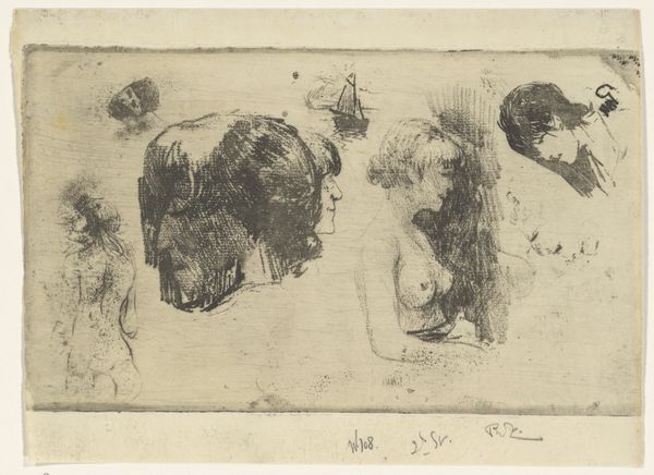 Curator: Here we have a drawing by Thomas Patch titled "Sketches of Male Heads (recto); Two Old Women (verso)", dating from around the 18th century. It's rendered in pencil on paper. Editor: It’s striking how unfinished yet expressive these studies of faces are, capturing a mood that is both contemplative and slightly melancholic. The artist’s mark making seems incredibly efficient, yet it clearly represents form in a distinctive way. Curator: Absolutely. Consider that paper at the time would have been quite expensive. The relative sketch-like appearance gives us an insight into Patch’s working process; he probably produced these drawings as preparatory studies. He would be looking to reuse materials when able. Editor: And look at the way the various subjects seem to cluster, with each portrait overlapping. Faces tilted in different directions suggests varied thoughts or states of being, creating a composition loaded with visual cues to possible internal character. What can you tell us about the other side, or verso, mentioned in the title? Curator: The other side, "Two Old Women", offers a glimpse into everyday life, which wasn't uncommon in some drawing at the time. Considering the cultural context of 18th century art, there was still a division between high art like history painting and what were seen as more lowly subjects. Editor: Yet, those sketches on the reverse still carry potent, symbolic weight. Older women often represented wisdom, or the transience of life, echoing memento mori traditions. Curator: Certainly, one might make that connection, while I see him more clearly making economic decisions related to expensive paper and production methods. Editor: Perhaps he found a canvas where symbolic expression and material constraints could meet and mix, generating this somewhat somber and yet lovely image. Curator: That’s a rather generous view, though one that underscores the enduring power of sketches. Editor: Precisely, something seemingly casual offering surprising, reflective depth.