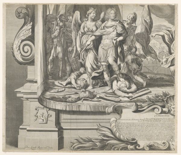 This print was made by Arnold van Westerhout, sometime between 1661 and 1725. The image is brought to life through the skilled cutting of a metal plate, likely copper. As a print, this work is inherently tied to the modes of production. Each impression is identical, made through the repeated application of pressure. This reproductive capacity gives prints a unique social role – disseminating images widely and relatively cheaply. Here, we see an allegorical scene lauding a specific individual, Joannes Baptista a Pfeiffersberg. The print format allows this praise to be distributed broadly, serving as a form of public relations, and possibly even self-promotion. Consider the labor involved: the artist's skill in rendering the scene, the press operator's physical effort, and the infrastructure that enabled the production and distribution of the print. It is important to remember that these mass-produced images, even those celebrating elites, depended on a broad base of labor and consumption. This brings into focus the complex relationship between art, class, and the burgeoning print culture of the early modern period.