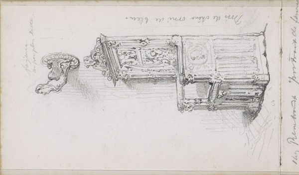Curator: This drawing, dating from 1867, is titled "Two Picture Frames, Including One with a Miniature" and was created by Maria Vos. Editor: There's a delicate quality to it. It almost feels like a fleeting thought captured on paper, rendered primarily with pencil and charcoal. Curator: Yes, the visible layering suggests that Vos focused on light and shadow to depict ornate picture frames that held small paintings or portraits. There's even the artist's inscription "woodwork and gilding". Picture frames play a fascinating role; beyond utility they are highly visible displays of status and wealth, literally framing our view of culture. Editor: And look closely. I notice the textural contrasts between the relatively simple rendering of the miniature's frame, and the wild embellishments depicted in the larger one. The lower register is also quite dark and filled with details. We might consider how this communicates relative value or simply what was immediately available. Curator: Precisely. Considering the socio-economic landscape of the mid-19th century, such detailed sketches would have appealed to a growing merchant class eager to display its affluence through refined possessions. What do these items reflect about shifting aspirations and values within society? Editor: That focus, along with the deliberate contrast between simple lines and complex shading, speak to her facility with the materials at hand, a humble act with rich implications that shouldn't be overlooked. Perhaps the accessibility of the frame itself allowed for greater appreciation than any "high art." Curator: Absolutely. And by creating it on paper with accessible and quick techniques like pencil and charcoal rather than, say, oil on canvas, she's democratizing not just access but perhaps also skill. Editor: A subtle point, but powerfully present when considering its context. Overall, these sketches serve as a valuable document for comprehending aesthetic values and market forces in that historical time period. Curator: Agreed. And perhaps that careful craftspersonship, even in sketch form, represents a statement in itself.