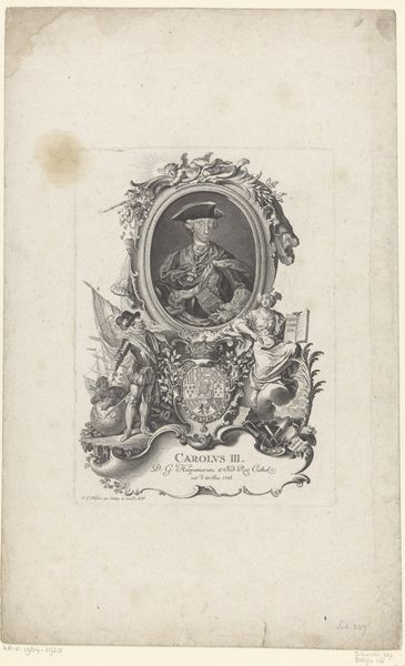 Editor: This is "Portret van Johann Friedrich von Schwarzburg-Rudolstadt," created between 1767 and 1788 by Johann Esaias Nilson. It's an engraving currently housed in the Rijksmuseum. The ornate detail is striking. What historical narratives can we unpack from this piece? Curator: Well, seeing an engraved portrait like this immediately tells us a lot about the social function of art in the 18th century. This wasn't just about commemorating an individual; it was a carefully constructed performance of power and status meant for wider dissemination. The elaborate frame, the heraldic symbols... how do those details strike you? Editor: I notice the symbolism, and it seems carefully constructed. Was portraiture like this used for propaganda or solidifying power? Curator: Absolutely! Think about the socio-political context: principalities like Schwarzburg-Rudolstadt were constantly vying for influence. Imagery became a crucial tool. Reproducing portraits allowed rulers to project an image of legitimacy and strength far beyond their immediate territory. What do you make of the figures surrounding the portrait itself? Editor: They seem to represent virtues or allegorical figures, a symbolic support for the Prince. Almost like political advertising. Curator: Precisely! It demonstrates how art served a crucial public role, reinforcing social hierarchies and political power. It reminds us that even seemingly simple portraits were deeply embedded in complex networks of patronage, power, and public image-making. Have your views shifted? Editor: Definitely! I now understand this is not just an image of a man, but a reflection of the entire societal structure of that time. Thank you. Curator: And I am reminded of the way artistic creation intertwines with politics. It enriches our understanding when we question an artist's impact on history.