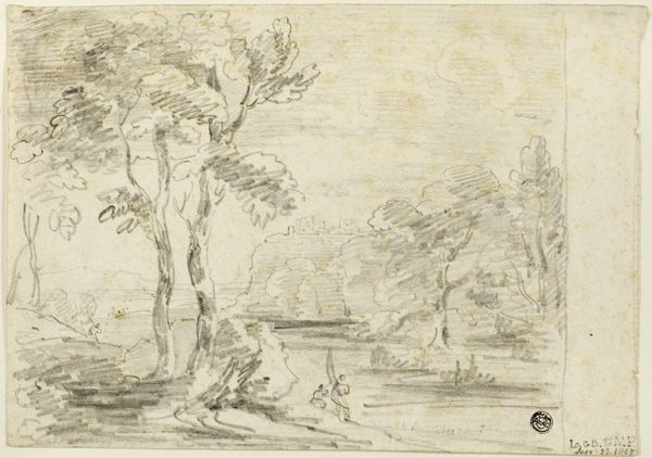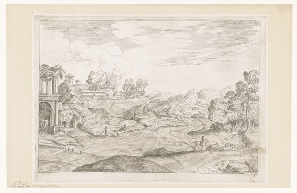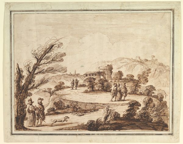 Anton Crussens created this landscape drawing with pen and brown ink in the mid-17th century. The composition, framed by a thin, dark line, reveals a scene where spatial depth is suggested through the use of light and shadow. The eye is drawn from the dark foreground, occupied by earthy formations and a winding path, towards the distant windmill, rendered faintly on the horizon. The figures dotted across the landscape are not merely anecdotal. Instead, they function as structural elements, guiding the viewer's gaze through the composition. Crussens masterfully employs line and texture to differentiate between near and far, solid and ethereal. This interplay reflects a fascination with perspective that destabilizes our conventional understanding of space. The drawing suggests a world where perception is not fixed, but rather a fluid and dynamic experience, questioning the very act of seeing and interpreting the landscape.