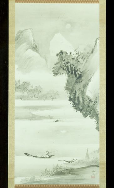 Curator: Here we have Kano Tan'yū’s "Landscape in Moonlight," an ink drawing on paper created sometime between 1663 and 1674. What's your first take on it? Editor: I’m struck by its quiet drama. The monochrome palette lends it a dreamlike quality, almost a memory. It feels vast, yet intimate. Curator: The vastness definitely speaks to the conventions of landscape painting in the Kano school. But the intimacy is important, too. Consider the historical context: the rise of the merchant class during the Edo period and the shift in patronage for the arts. How might that affect Tan'yū’s interpretation of traditional themes? Editor: The moon, of course, appears frequently in art history across various cultures, often representing feminine power, the subconscious, hidden emotions, or cyclical changes, what cultural values are symbolized here, and in East Asian art generally? Curator: Well, we have to consider the integration of Chinese philosophical and aesthetic values. The moon in East Asian art can symbolize enlightenment, purity, and the transient nature of existence – ideas deeply entwined with Buddhist and Daoist thought. Then look at the composition. Editor: The artist used a stark contrast in the application of monochrome ink. Curator: Yes. With such minimalist means. Think of how Tan'yū manages to capture atmospheric perspective solely through gradations of ink, creating depth and distance with such limited tonal range. What does the rendering tell us? Is it a statement about artistic practice and society, about those limits or pushing against them? Editor: Maybe. To me, the small boat sailing toward the open water hints at human resilience in the face of nature’s grandeur. Its small scale emphasizes humanity's relative position to a landscape in Moonlight. There's also the psychological aspect. The emptiness could symbolize loneliness or self-reflection. The emotional content of that symbolism remains universal. Curator: Absolutely. And it is precisely in these nuances of ink, in these subtly placed elements, that we see Tan'yū engage with both established traditions and emergent societal shifts, creating an image that's both aesthetically beautiful and culturally relevant, a statement that is very true today as well. Editor: Agreed. The image prompts an interior journey. Curator: An appropriate and insightful observation about a culturally resonant work!