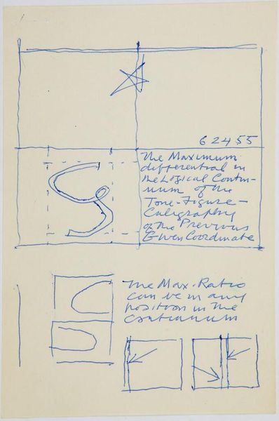 Editor: Here we have Stuart Davis's "Art Theory Text with Sketch." This captivating work on paper gives us a glimpse into the artist's mind. It's dated 1955. What strikes you about this piece? Curator: It’s like peering into Davis's sketchbook, a visual jazz improvisation. The text, almost stream of consciousness, paired with these geometric doodles, gives us a sense of his artistic process. Notice the phrase “Speed is clarity, not sloppy.” It feels like a mantra, doesn’t it? A reminder to trust intuition. Editor: Absolutely. It almost feels like he’s talking to himself, working through some ideas. Did he often combine text and image in this way? Curator: He did! Davis sought a visual language that echoed the energy of modern life. The text isn’t just explanation; it's another layer of the composition, a rhythm. What do you make of this interplay? Editor: I like that idea of the text being another layer. It makes the piece feel more dynamic, like a conversation. Curator: Precisely! It’s not just seeing, but thinking, feeling, questioning. I think that's the core of the piece.