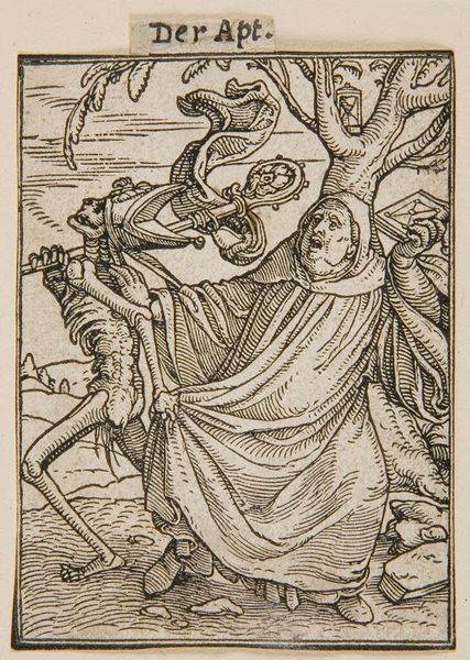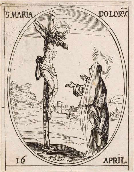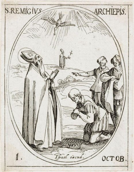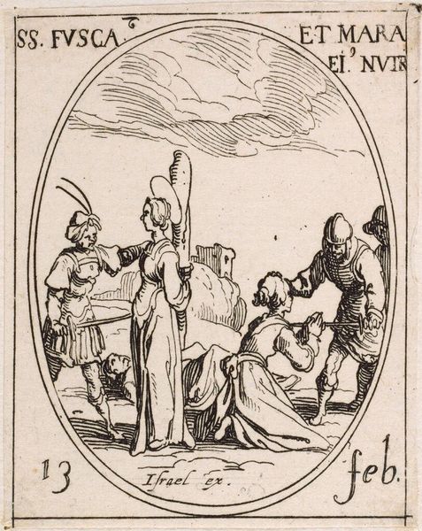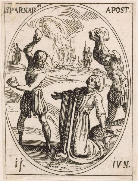 Editor: This is Jacques Callot's "Saint Edmund of England," an etching. It's quite small, only a few inches. The scene is violent - Edmund being shot - yet there's a strange serenity about the figure. What layers do you see in this depiction? Curator: The passivity is key. It speaks to the historical narrative of martyrdom but also raises questions about power, resistance, and the construction of sainthood within colonial contexts. Is Edmund a symbol of faith or a victim of political expediency? Editor: So, it's not just about religious devotion, but about how power is wielded? Curator: Exactly! This image encapsulates the complex intersections of religion, violence, and imperial control. Think about how Callot frames Edmund's quiet acceptance against the active aggression. Editor: It's a much more loaded image than I initially thought. Thank you.