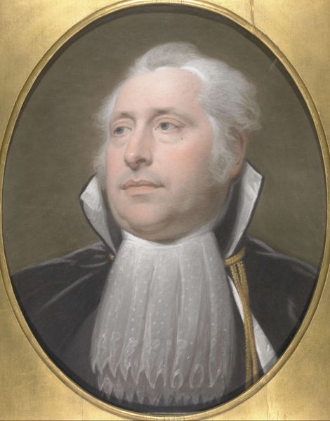 Curator: This is a portrait of John Ross, the Bishop of Exeter, painted by Lemuel Francis Abbott. Editor: My initial reaction is one of slight…severity? The high contrast and dark background really amplify the Bishop’s solemn expression and that powdered wig adds to the formality. Curator: Indeed. Portraits like these were often commissioned by institutions or wealthy families, and they served as visual affirmations of status and power. Ross was an influential figure in the Church of England, and this image likely reflects his perceived role within that hierarchy. Editor: Absolutely, it’s hard to separate the individual from the institution here. That heavy black vestment seems to blend into the background, creating an imposing, almost impenetrable visual presence. I’m curious how much control Ross had over the portrayal. Was it purely celebratory, or was it also about control and enforcing an image of authority? Curator: That’s a very important point. Artists at this time had a formula, particularly with prestigious sitters such as bishops. But they could exercise degrees of skill in portraying the subjects. The use of light and shadow creates depth and complexity. It's difficult to assess the circumstances of production. Ross’s patronage reflects the visual rhetoric the Church had at its disposal at the time. Editor: Rhetoric, definitely. The gaze is direct but not inviting. His expression feels very carefully controlled, masking something behind a facade. It makes me wonder what tensions might have been present between the man and his office, particularly considering the shifting social and religious landscape of the time. Curator: These portraits are products of the time they were painted and viewed. There has been lots of work to look at class, race and gender, and Abbott and Ross inhabit none of the more vulnerable categories of identification. Still, a portrait can be a good start in opening conversations about how power is managed, and whose images end up in institutions and how those figures remain represented. Editor: Agreed. Thinking about historical and modern implications surrounding such images makes me recognize how critical art is in understanding and challenging power dynamics in institutions that remain potent today. Curator: Absolutely. This artwork opens a wide discussion around identity, representation and how we got to the modern era of museums. Editor: A vital and engaging entry point into art history!