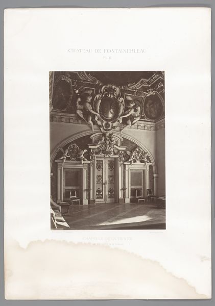 Curator: Here we have a photograph by Médéric Mieusement, taken before 1875, titled "View of a Wall with Decorations in the Galerie François Ier of the Château de Fontainebleau, France." Editor: Wow, instantly, it feels so formal and grand, yet also surprisingly…static. Almost like a stage set waiting for the actors to arrive. There's an overwhelming sense of controlled opulence, you know? Curator: Precisely! Mieusement's photograph provides invaluable documentation. Consider the political implications of capturing such a significant royal space. He's not just documenting architecture; he's preserving an image of power and legacy at a time when those things were very unstable in France. Editor: I love how the light kind of pools in the foreground, drawing you in. The high-contrast is really effective. And I'm intrigued by the roundel on the wall...what story is unfolding within that painted frame? It's sensual, but then you’re snapped back into reality with those slightly awkwardly placed chairs in the foreground! Curator: The roundel, and all the surrounding ornamentation for that matter, are deliberately evocative. The Galerie François Ier was one of the first great decorative schemes of the French Renaissance. Its purpose was to advertise the king's sophistication, wealth, and good taste by referencing classical and mythological themes. The photograph lets us see the design as a carefully constructed symbol of royal authority. Editor: Thinking about it more, I'm almost getting a whiff of melancholia here too. It is maybe because it’s just a photo and not real life... Or is it the weight of all that history, all those figures looking down from the walls. Knowing all that history makes the scene very heavy, doesn’t it? Curator: Indeed, Mieusement's work serves as both record and interpretation. He chooses a particular angle, a specific lighting condition, inviting viewers, even us today, to reflect on how such spaces shaped not just aesthetics, but also political ideologies. It really prompts us to consider the layers of meaning within what might seem like a simple photograph of a room. Editor: And I am so interested to look deeper... to unravel the narratives that lie hidden behind its stoic façade and opulent decorations. It is incredible how an image can hold both profound stillness and an invitation for restless pondering, all at the same time.