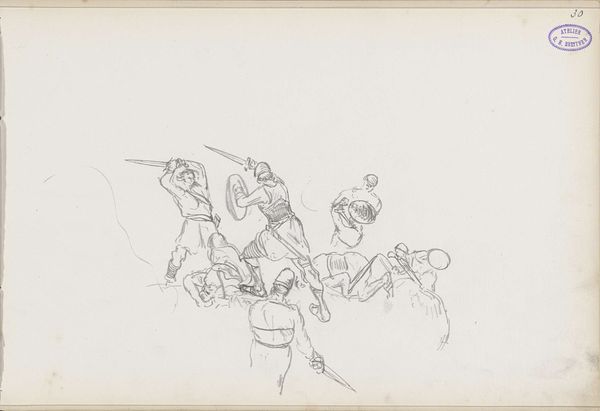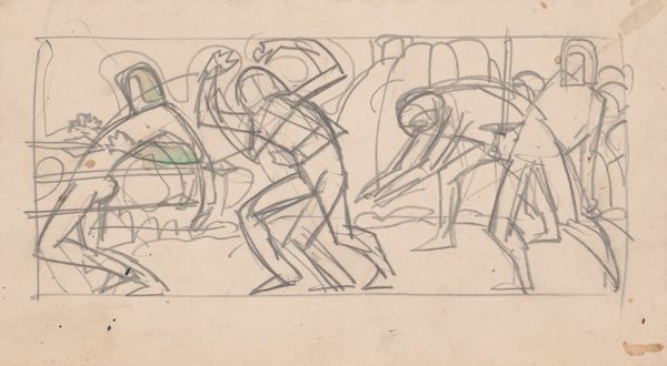 Editor: This is "Riders," a pen and ink drawing by Arnold Peter Weisz-Kubínčan, created sometime between 1930 and 1945. It has such a frantic energy! It feels like a fleeting dreamscape. How do you interpret the visual dynamic here? Curator: The interplay of line and form certainly establishes a dynamic tension. Note how the artist uses primarily contour lines, favoring suggestion over explicit representation. This lends itself to a sensation of movement, doesn’t it? Editor: Absolutely. The horses are almost dissolving into the landscape. Is the lack of detail intentional? Curator: Indeed. By minimizing detail, the artist privileges the fundamental visual elements, enabling us to contemplate the very essence of form and movement. Consider the rhythmic repetition of the horse’s legs, the sweeping lines that define their bodies… What feelings are conveyed? Editor: It does evoke a sense of urgency and even anxiety, perhaps reflective of the turbulent times in which it was created. The abstract shapes invite personal reflection. Curator: Precisely. This prompts viewers to engage actively in completing the image. It's the active semiotic interplay between what is presented and what is unsaid. Editor: I see. The incomplete forms push the viewer to project meaning onto the work. Curator: And this tension, this dialogue between artwork and observer, constitutes the artwork's essence. We find significance not in specific symbols, but through structural relationships of visual forms that engender affect. Editor: I now grasp how formal analysis invites understanding that transcends literal representation. It transforms our interaction. Curator: Indeed, by concentrating on its inherent components, the art unveils layers of connotation.
