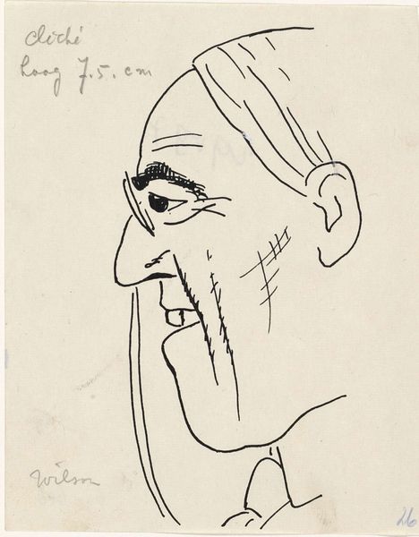 Editor: Here we have Leo Gestel's "Portrait of Thomas Woodrow Wilson," created between 1934 and 1936, using pen and ink. It's at the Rijksmuseum. The raw, almost skeletal lines give it a strikingly haunting feeling. What do you make of it? Curator: Haunting is a great word for it. I see a man, stripped down to the bones of his character, or at least Gestel's interpretation of it. It feels raw, yes, unfinished, like a memory struggling to solidify. And those lines, like scars mapping his face – perhaps the weight of the world etched upon him. What strikes you most about the technique? Editor: I'm drawn to the background. It’s just frantic, scribbled lines, like a storm raging around his head. Curator: Precisely! And the eyes… They're intense, observant, almost wary. It’s like Gestel is saying, "Here’s Wilson, but seen through a lens of post-war disillusionment, perhaps." Or even seen through the artist's own anxieties and uncertainties. It seems like this isn’t just a portrait of a president; it's a mirror reflecting a fractured era. Do you think Gestel intended to humanize Wilson, or critique him? Editor: Maybe both? The frantic lines make me think critique, but then those eyes… They give him humanity. Curator: Beautifully put. It's that ambiguity, that tension between admiration and disillusionment that gives the piece its lasting power, don’t you think? Editor: I do. It makes you think about how we remember historical figures – not as heroes or villains, but as complex people. Curator: Exactly. Art is like that, it can make you ponder the narratives that shape us.
