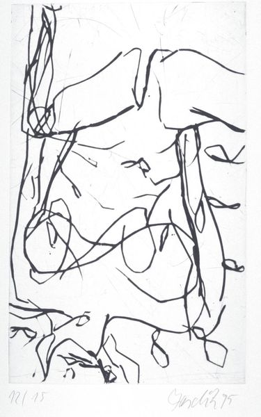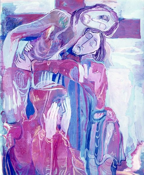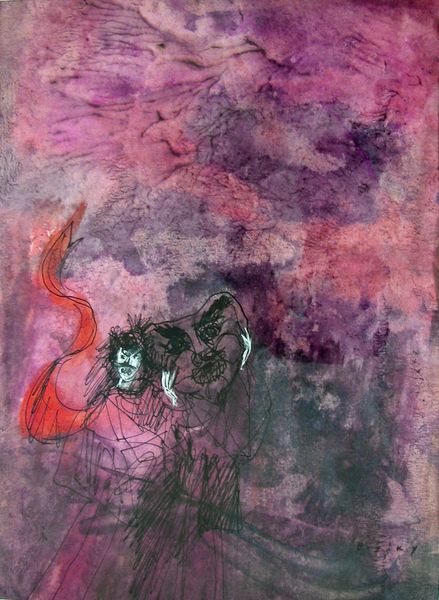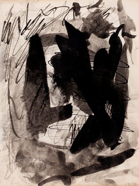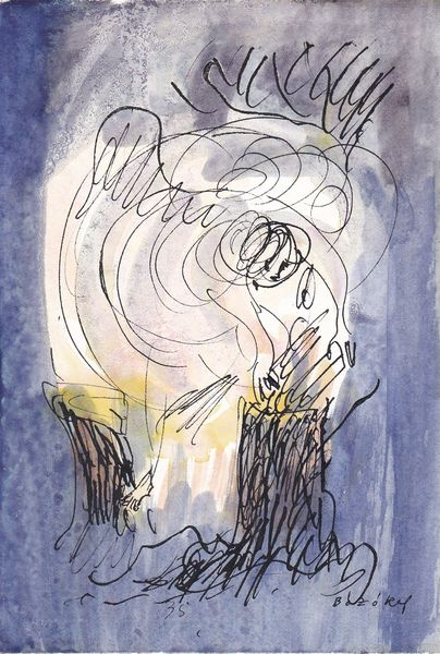 Editor: We're looking at "Csokonal: Torrent Rain (Summer)" from 1983, by Maria Bozoky, which appears to be created with watercolour and ink. I am struck by how much movement the lines convey; it really does feel like looking up at a summer storm. How do you interpret this work? Curator: It’s interesting you say "movement," because the deluge of line, form, and suggestion speaks to a cultural memory around purification and release through water. Notice the almost spectral figure at the top, rendered with less certainty than the abstract flora below. What does this ethereal quality suggest to you? Editor: Perhaps that the figure is being cleansed or transformed by the rain, becoming one with the natural world represented below? Curator: Precisely. Consider also the weight that "summer" carries: a season of growth and vibrancy, contrasted here with the turbulence of a torrential downpour. This visual paradox touches something deep within our shared experience. Look at how those looping ink lines overlay the soft washes of colour. They are a powerful emotional language here. Does the artist successfully marry abstraction and figuration in your eyes? Editor: I think the abstraction amplifies the emotional impact. If it were strictly representational, it might lose some of that intensity, of the raw feeling. It feels quite personal. Curator: It speaks to our continuous reinterpretation of the symbols of nature and renewal, which art preserves as emotional memory. Do you agree the flowers carry significant weight? Editor: Absolutely! It seems like chaos and rebirth coexisting, maybe that’s what summer rain is really about. I never considered its connection to purification until now.