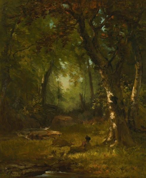 Curator: Right now, we're looking at Albert Bierstadt's "Deer in a Clearing, Yosemite." This landscape painting evokes the serene grandeur that Bierstadt captured so vividly in his views of the American West. Editor: Whoa, it's like stepping into a golden dream. The light is so intense and soft. You almost feel like you could just melt into that meadow. Curator: The Hudson River School artists, like Bierstadt, saw the land as embodying American potential. They emphasized nature as sublime, an untouched wilderness filled with promise. I think it is really interesting to analyze Bierstadt through the lenses of Manifest Destiny and colonial impact. Editor: It is stunning, sure. And that impasto really makes those trees jump out! But... all that untouched wilderness? Didn't someone live there? I wonder if that deer herd is all that remains of what was erased for this idealized view of paradise. It's complicated, because this landscape romanticizes what it actually signifies, namely the erasure of Native American presence. Curator: Absolutely, your perspective is essential. It’s crucial to consider the narratives left out. How does the artistic license that he exercises conceal the history of exploitation? Editor: Yeah, so you look at the glowing, magical mist, and it's gorgeous. And then you have to ask yourself: At whose expense? I like the chiaroscuro effect going on, the way the artist really worked with contrasting shadows. The fog sort of hints at secrets lurking behind. Curator: The placement of those animals as well is crucial. The painting might represent how, as humans, our presence impacts the natural world, sometimes forcing wildlife into specific, and perhaps shrinking, territories. It raises complex questions about our role in shaping environments and societies. Editor: It makes you think. I was lost in the pretty colors, and you steered me straight into history. The piece certainly isn't as straightforward as its surface beauty lets on! Curator: Precisely. Analyzing how landscapes mediate ideology unveils historical dimensions often glossed over. Editor: Yeah, thanks for muddying up the pretty picture with a dose of reality. Appreciate it!