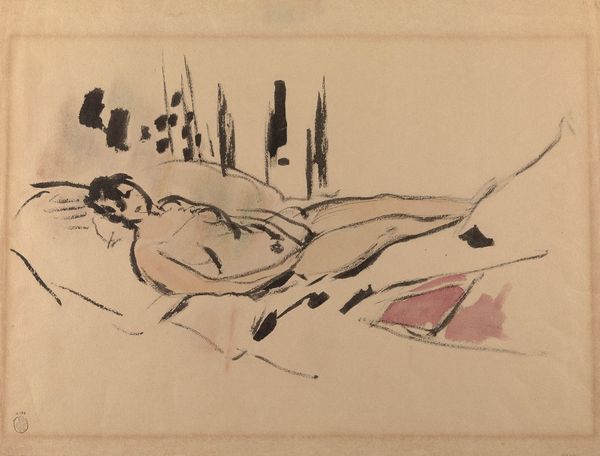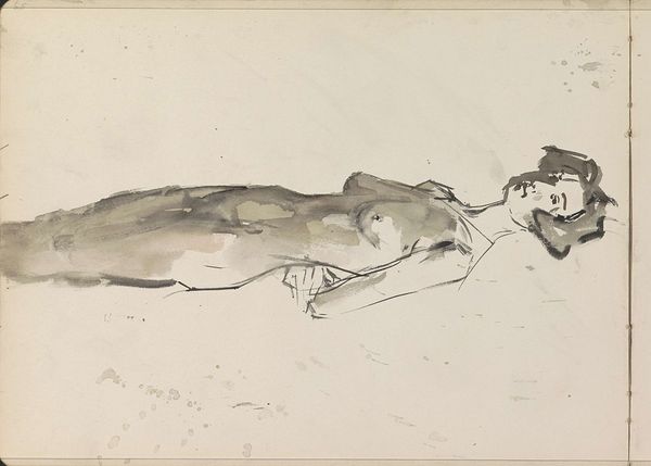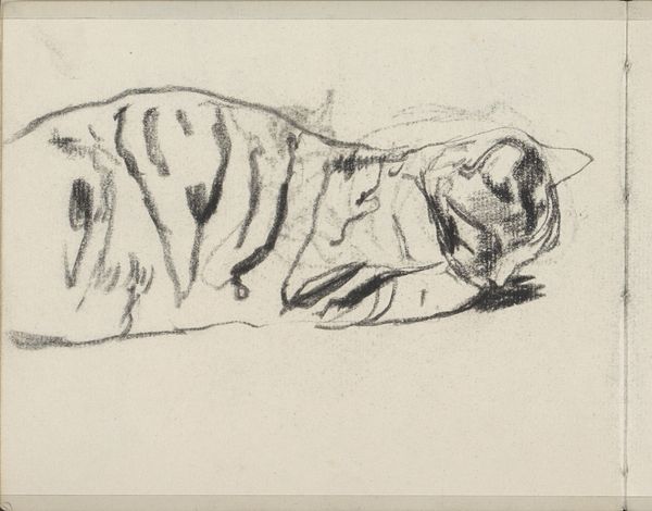 Curator: Welcome to the Rijksmuseum. Here we have Johannes Tavenraat’s "Jachthond," an ink drawing dating from around 1840 to 1880. Editor: My initial reaction is how evocative the economy of line is here; the dynamism is really palpable. The monochrome wash creates a somber mood, despite depicting an active subject. Curator: Absolutely. It's vital to see this image as situated within shifting human-animal relationships of that time. The artwork comes on the heels of increasing dog breeding and dog training that saw companion animals shift from utility, guarding and hunting, towards their role as empathic mirrors of our very selves. It prompts important questions about animal rights then and now. Editor: I appreciate the connection you're making. From a formal perspective, notice the lack of background detail? The minimal lines create this flat ground suggesting an emphasis not on its environment but on the shape of the hunting dog itself. It’s almost suspended in motion through its streamlined design. Curator: Consider though that such artistic choices further entrenched then-contemporary views of animals solely in relation to human use, negating their own realities of simply inhabiting space as autonomous actors in any landscape or milieu represented. This is an instance of anthropocentrism in Romantic artwork that demands closer critical investigation. Editor: I concur that such anthropocentric interpretations merit rigorous examination; I just am drawn to its sheer expressiveness and the mastery conveyed through skillful simplification of form and its composition and its tonality that all adds to a sense of drama in mid-movement—an impressive and affective aesthetic strategy deployed skillfully in Romantic tradition for which these artistic liberties create such visual depth with so few elements rendered explicitly for detail's sake! Curator: It’s crucial that we read Tavenraat's "Jachthond" not merely as an isolated instance of artistic expressiveness but in terms of broader conversations then about colonialism and resource extraction during this time of global expansion wherein working animals figured prominently in labor, land acquisition practices across subjugated territories, often functioning unwittingly instrumentally to extend systemic violence wrought on people and eco-systems as a result! Editor: I see that. I hadn't previously examined how form could reflect cultural ideology and oppression this way and am interested in delving further into sociohistorical meaning that shapes one’s appreciation when contextualized through such theoretical lenses! Curator: Exactly—art invites exploration; and inquiry across history through such interpretive paradigms empowers our sense of empathy toward building more awareness collectively that enables more engaged critical examination toward complex global inter-relations!